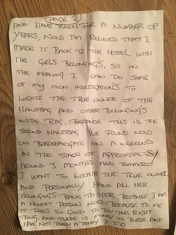 In the three-page note he attached to the bag, Mr Calderbank wrote: "I want to locate the true owner and personally hand all her belongings back to her, because I am an honest person now, because to me it feels so good to do the right thing, and there is money in the purse and I have not taken a penny.