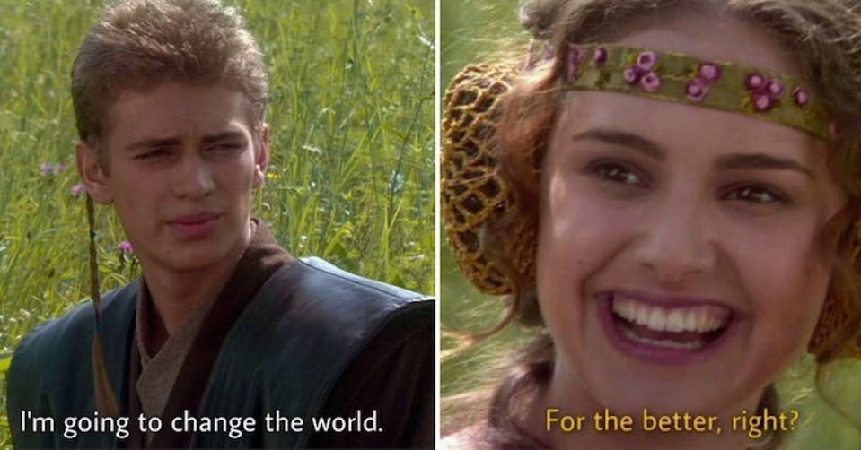 What you’ll need: Anakin needs a blue bathrobe and fake rat tail. Padmé needs a headband and a hair net. Maybe you could go the extra mile by carrying around text captions!