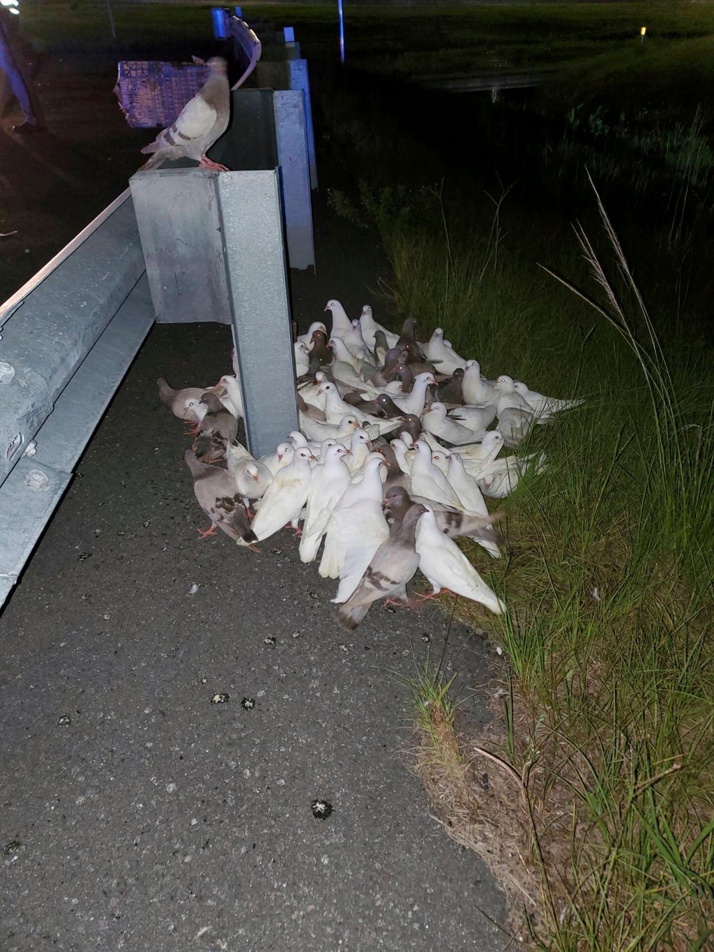 A crate carrying 100 homing pigeons fell off the truck late Tuesday near Daytona Beach Because the birds roost at night, the pigeons stayed on the road until bright lights from vehicles startled them. They flew into the air and created a hazard for drivers, according to a news release from Volusia County officials.