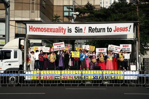 The resulting fears about HIV/AIDS and the perceived dangers of queer people brought droves of anti-LGBTQ protesters to a queer culture festival in Seoul in June 2015. When I spoke there to one male protester, he gestured to festival-goers across the street, saying they had the so-called “super virus,” but explained that the people with him were protected by the Holy Spirit.