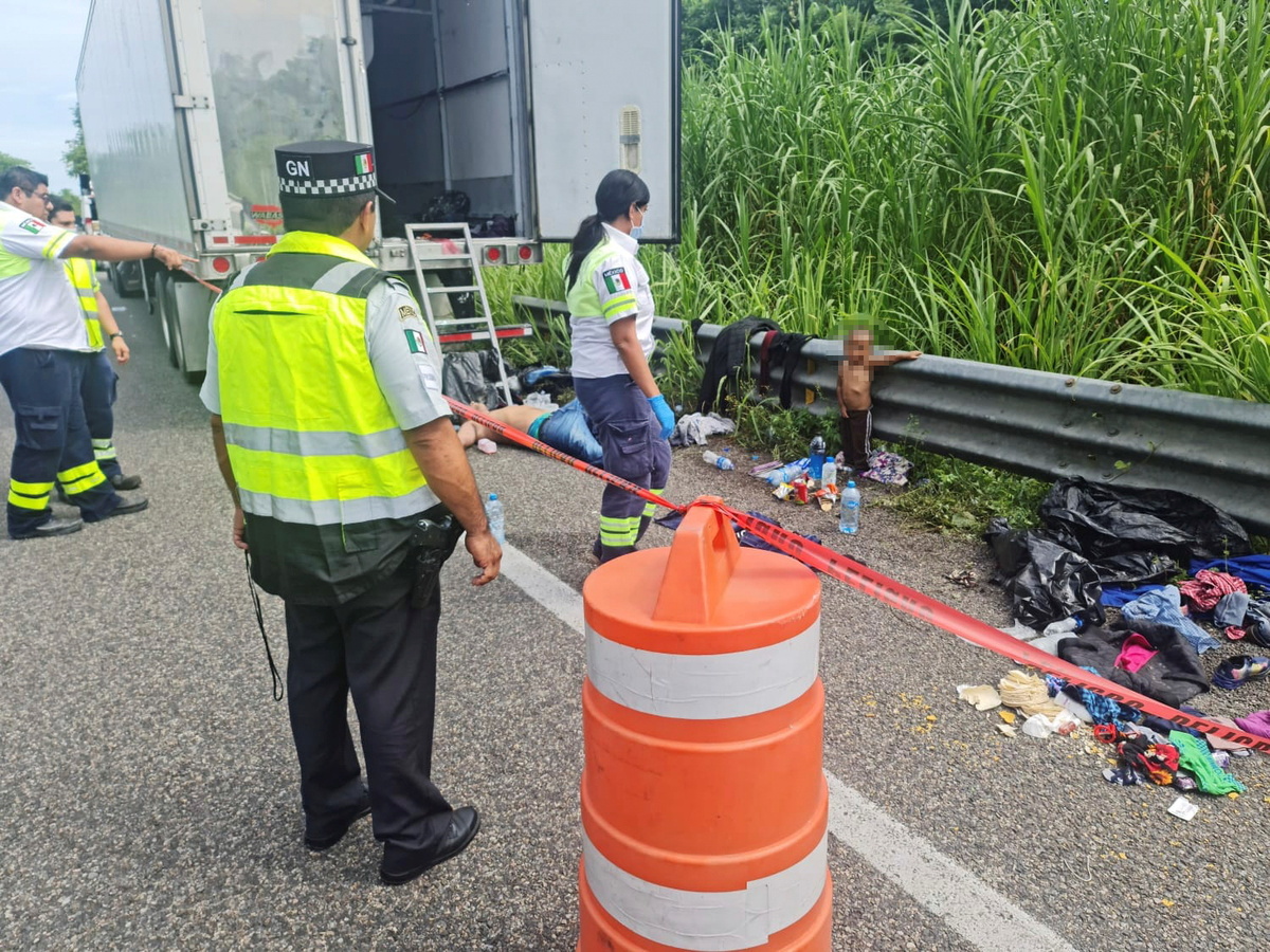 Wearing no shirt, the boy, thought to be aged 2, was found alone on the roadside in Veracruz state, surrounded by snack wrappers, half-empty water bottles, clothes from other migrants and black trash bags scattered on the ground.