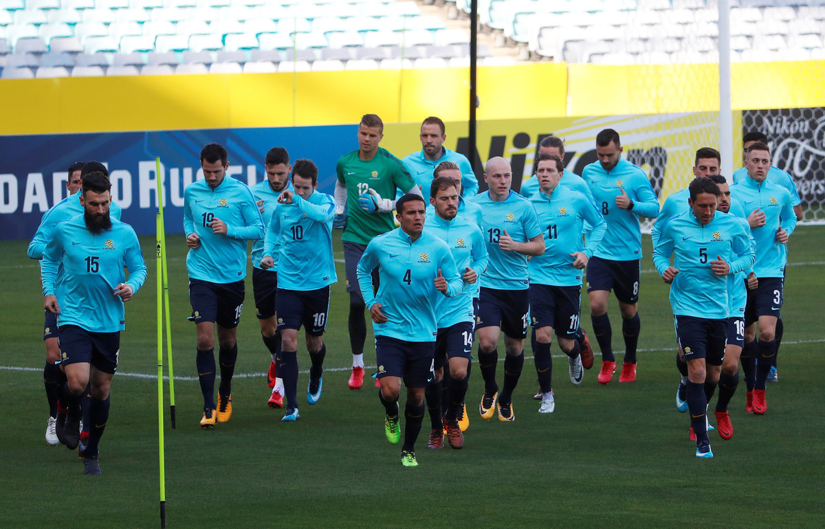 Football Soccer - 2018 World Cup Qualifiers - Honduras Training - Sydney, Australia - November 13, 2017. Honduras player Carlo Costly plays with a ball during a training session ahead of their World Cup playoff against Australia. REUTERS/Daniel MunozFootball Soccer - 2018 World Cup Qualifiers - Honduras Training - Sydney, Australia - November 13, 2017. Honduras coach Jorge Luis Pinto from Colombia gestures during a training session ahead of their World Cup playoff against Australia. REUTERS/Daniel MunozFootball Soccer - 2018 World Cup Qualifiers - Australia Training - Sydney, Australia - November 13, 2017. Australian players run during a training session ahead of their World Cup playoff against Honduras. REUTERS/Daniel MunozFootball Soccer - 2018 World Cup Qualifiers - Australia Training - Sydney, Australia - November 13, 2017. Australian player Tim Cahill plays with a ball during a training session ahead of their World Cup playoff against Honduras. REUTERS/Daniel MunozFootball Soccer - 2018 World Cup Qualifiers - Australia Training - Sydney, Australia - November 13, 2017. Australian players run during a training session ahead of their World Cup playoff against Honduras. REUTERS/Daniel MunozFootball Soccer - 2018 World Cup Qualifiers - Australia Training - Sydney, Australia - November 13, 2017. Australian players Tim Cahill, Bailey Wright, Massimo Luongo and Trent Sainsbury during a training session ahead of their World Cup playoff against Honduras. REUTERS/Daniel Munoz