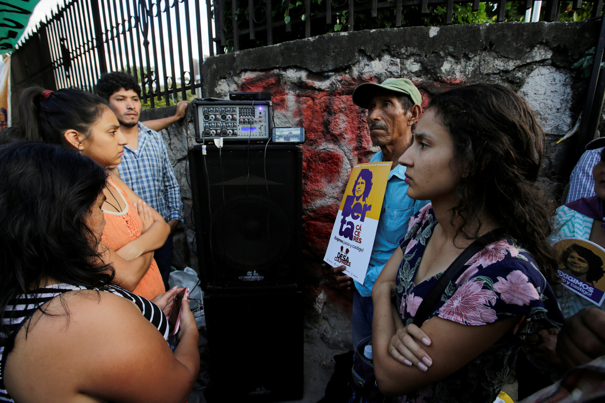 Demonstrators listen to the trial of the men charged with the murder of indigenous environmental activist Berta Caceres outside a court, in Tegucigalpa, Honduras November 29, 2018. REUTERS/Jorge Cabrera