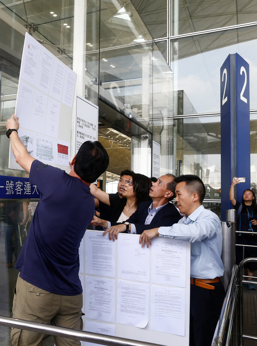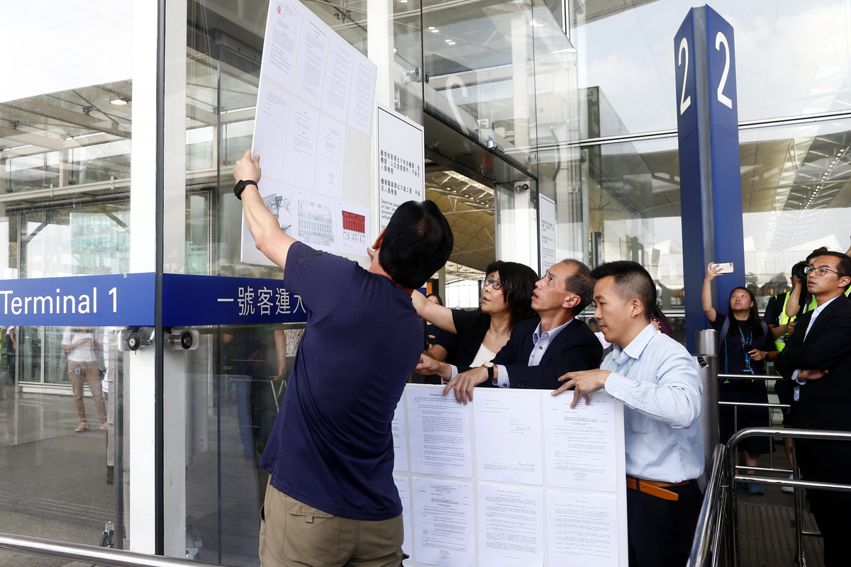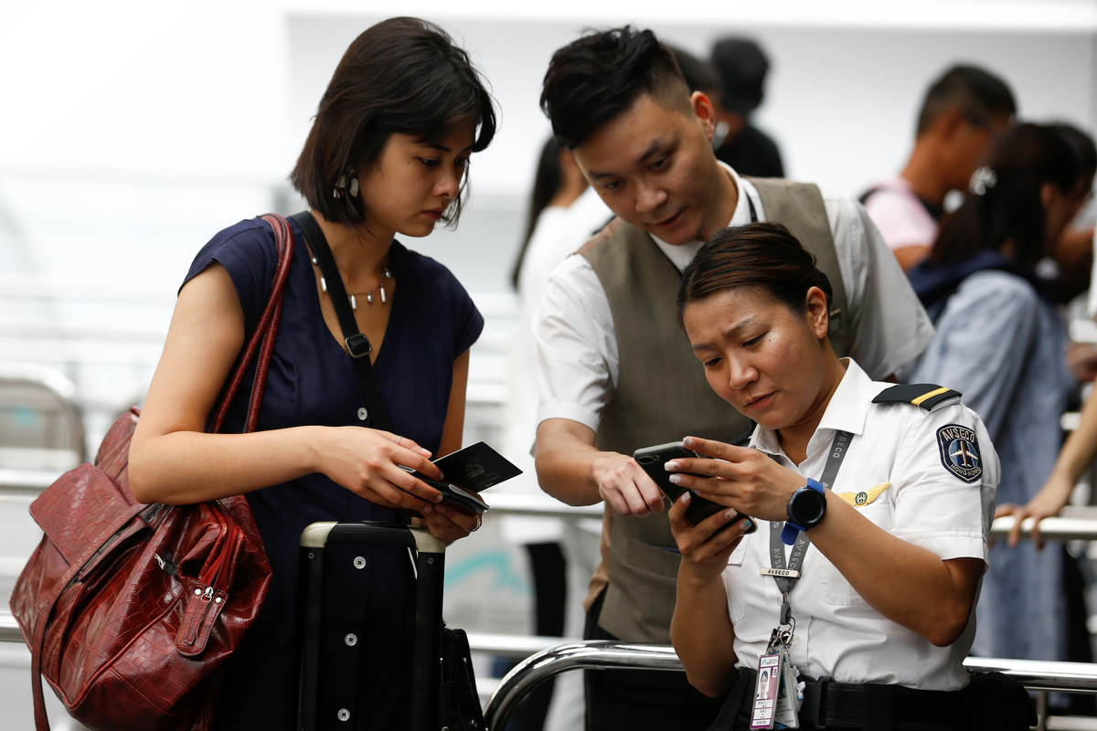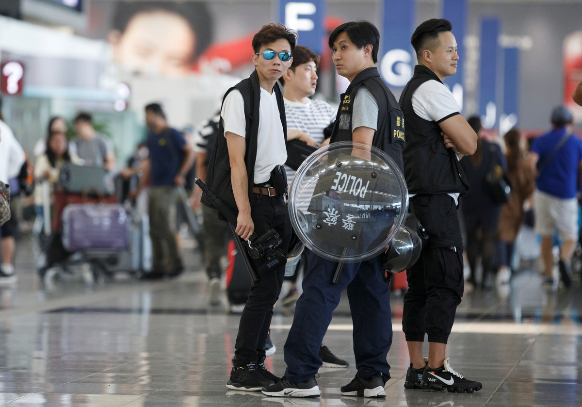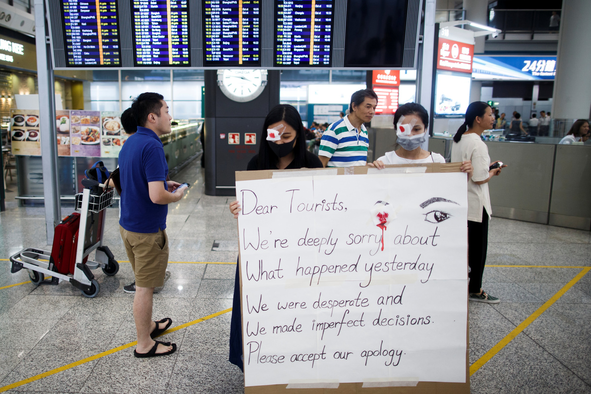 At Hong Kong airport, which was designed by renowned British architect Norman Foster, blood, debris and signs of the scuffle were scrubbed away during the night, and cleaners and protesters themselves removed anti-government posters from the walls.