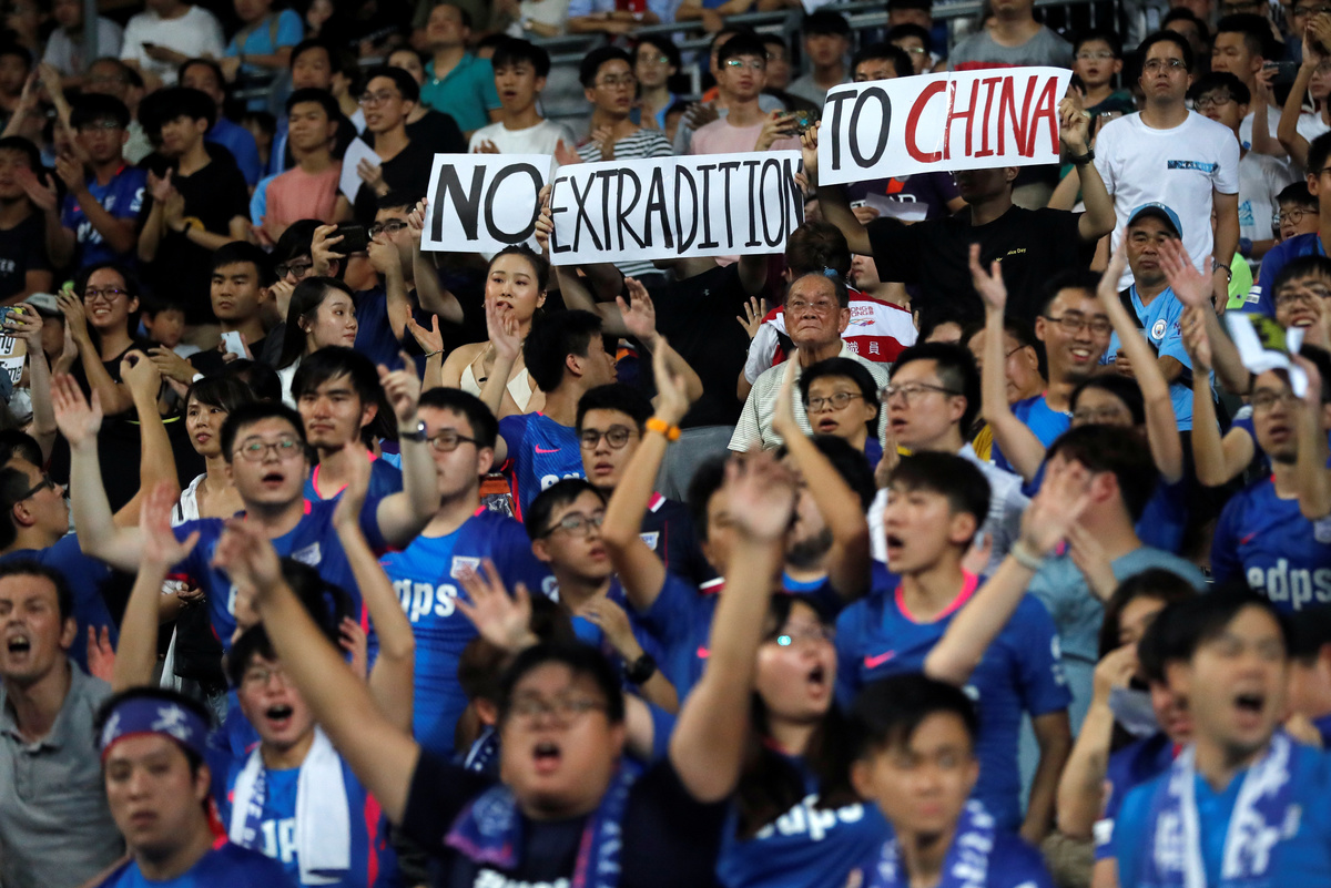 HONG KONG (Reuters) - Hong Kong soccer fans sang protest songs and waved anti-government banners as politics spilled into the sporting arena on Wednesday during a friendly game involving English Premier League champions Manchester City in the China-ruled city.