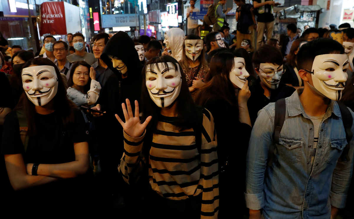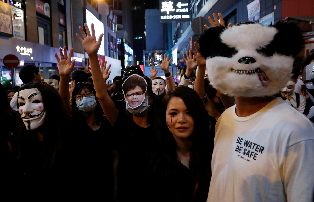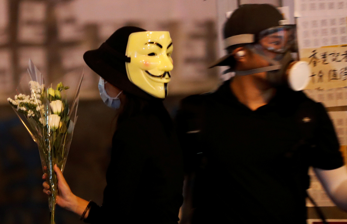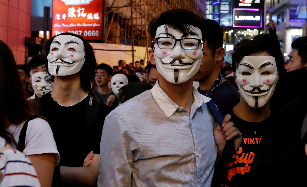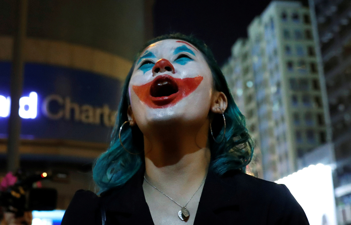 Many of the protesters wore the Guy Fawkes masks made popular by anti-establishment hackers, others wore the clown make-up of the deranged title figure in the movie "Joker". One was dressed up as Hong Kong leader Carrie Lam in a dog collar and on a leash.