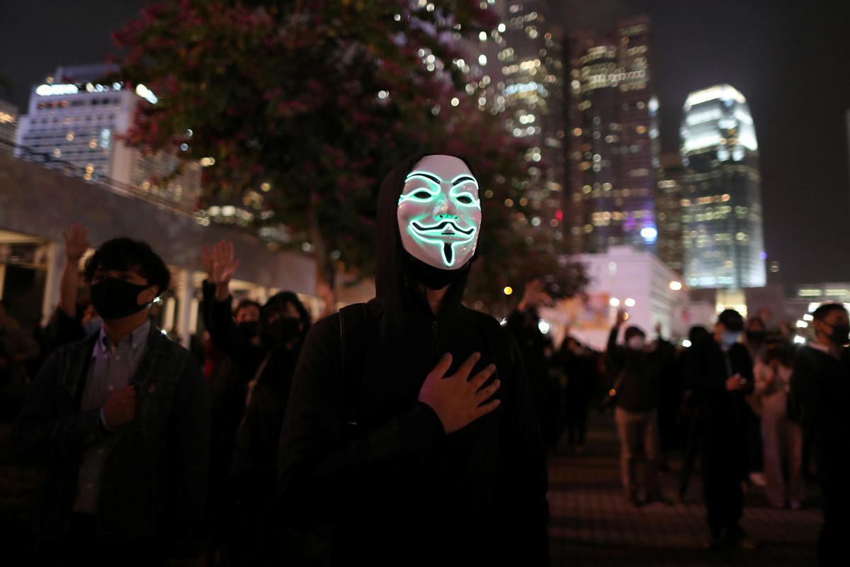 Henry, a 28-year-old banker, said he was in the plaza to protest a recent police shutdown of Spark Alliance, a fund-raising platform for protesters. He wore a Guy Fawkes mask from the movie "V for Vendetta", which glowed green in the dark.