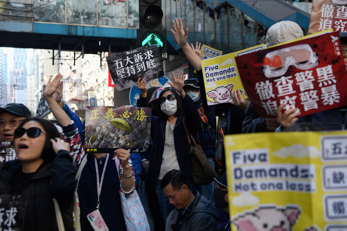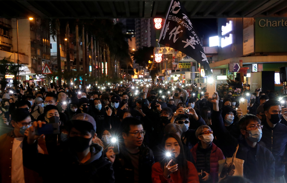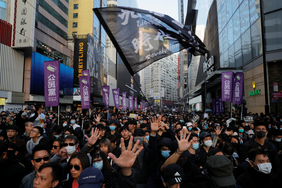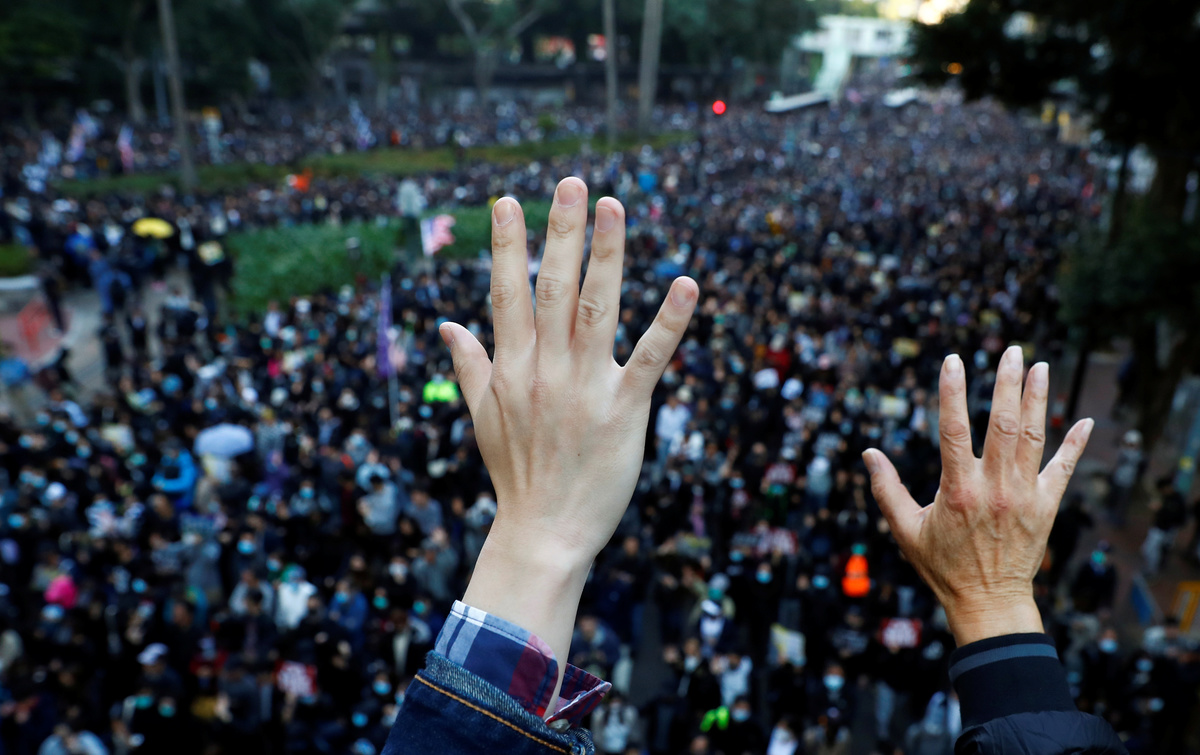A protester raises up his hand as he holds a placard reading "Five demands, not one less!" during a Human Rights Day march, organised by the Civil Human Right Front, in Hong Kong, China December 8, 2019. REUTERS/Thomas PeterPeople walk during a Human Rights Day march, organised by the Civil Human Right Front, in Hong Kong, China December 8, 2019. Picture taken with a long exposure. REUTERS/Danish SiddiquiPeople attend a Human Rights Day march in the district of Causeway Bay in Hong Kong, China December 8, 2019. REUTERS/Laurel ChorProtesters attend a Human Rights Day march, organised by the Civil Human Right Front, in Hong Kong, China December 8, 2019. REUTERS/Danish SiddiquiA general view of protesters as they attend a Human Rights Day march, organised by the Civil Human Right Front, in Hong Kong, China December 8, 2019. REUTERS/Danish SiddiquiA protester wearing a Guy Fawkes mask waves a flag during a Human Rights Day march, organised by the Civil Human Right Front, in Hong Kong, China December 8, 2019. REUTERS/Danish SiddiquiProtesters attend a Human Rights Day march, organised by the Civil Human Right Front, in Hong Kong, China December 8, 2019. REUTERS/Danish SiddiquiProtesters hold up their hands, representing the five demands of the anti-government movement, during a Human Rights Day march, organised by the Civil Human Right Front, in Hong Kong, China December 8, 2019. REUTERS/Thomas PeterProtesters attend a Human Rights Day march, organised by the Civil Human Right Front, in Hong Kong, China December 8, 2019. REUTERS/Leah MillisProtesters attend a Human Rights Day march, organised by the Civil Human Right Front, in Hong Kong, China December 8, 2019. REUTERS/Danish SiddiquiProtesters hold up their hands representing the five demands of the anti-government movement during a Human Rights Day march, organised by the Civil Human Right Front, in Hong Kong, China December 8, 2019. REUTERS/Thomas PeterProtesters attend a Human Rights Day march, organised by the Civil Human Right Front, in Hong Kong, China December 8, 2019. REUTERS/Danish SiddiquiA protester holds up his hand, representing the five demands of the anti-government movement, during a Human Rights Day march, organised by the Civil Human Right Front, in Hong Kong, China December 8, 2019. REUTERS/Thomas PeterA riot police officer points his weapon during a Human Rights Day march, organised by the Civil Human Right Front, in Hong Kong, China December 8, 2019. REUTERS/Leah MillisPeople attend a Human Rights Day march in the district of Causeway Bay in Hong Kong, China December 8, 2019. REUTERS/Laurel ChorProtesters attend a Human Rights Day march in the district of Causeway Bay in Hong Kong, China December 8, 2019. REUTERS/Laurel ChorA protester spray paints on a roadblock during a Human Rights Day march, organised by the Civil Human Right Front, in Hong Kong, China December 8, 2019. REUTERS/Thomas Peter