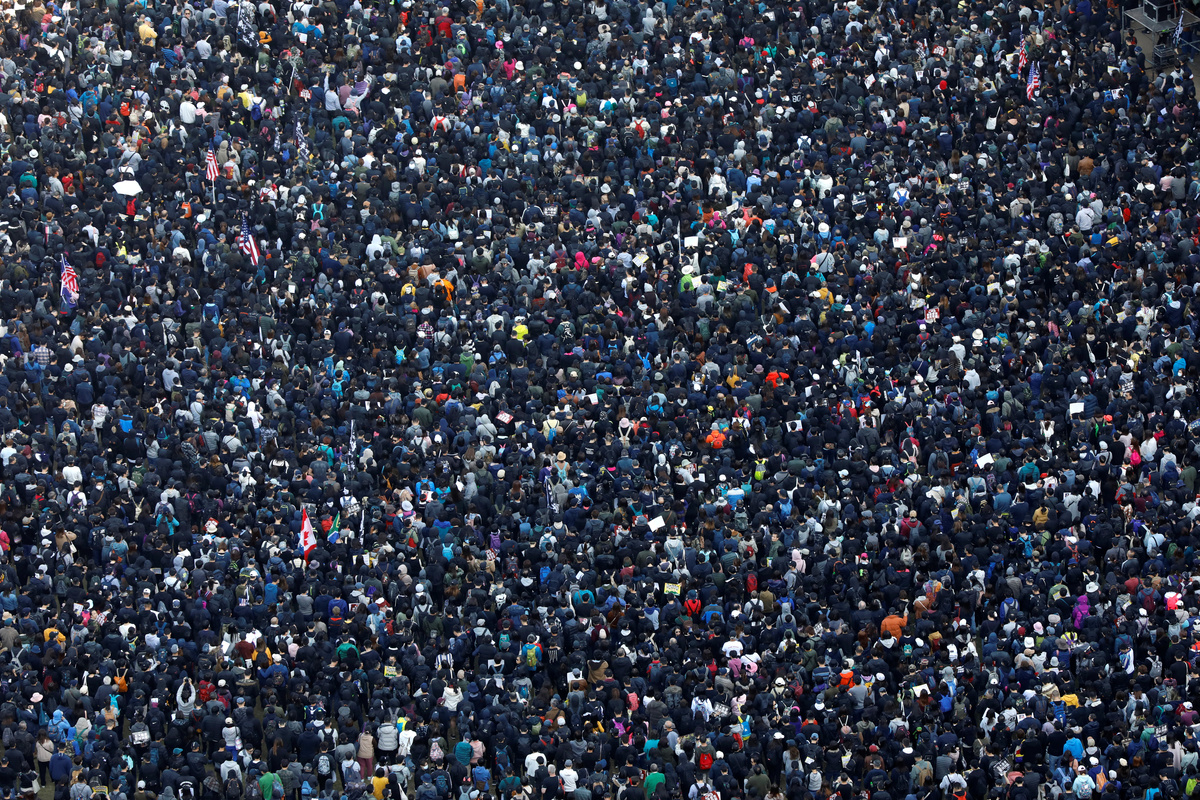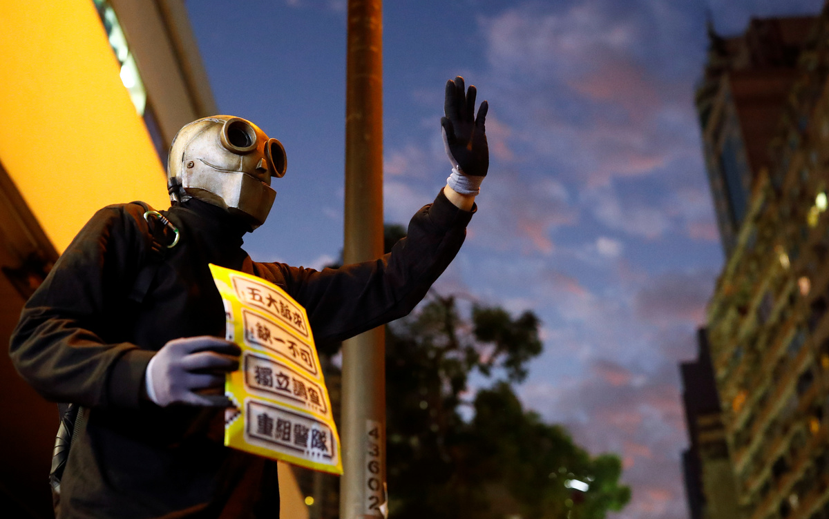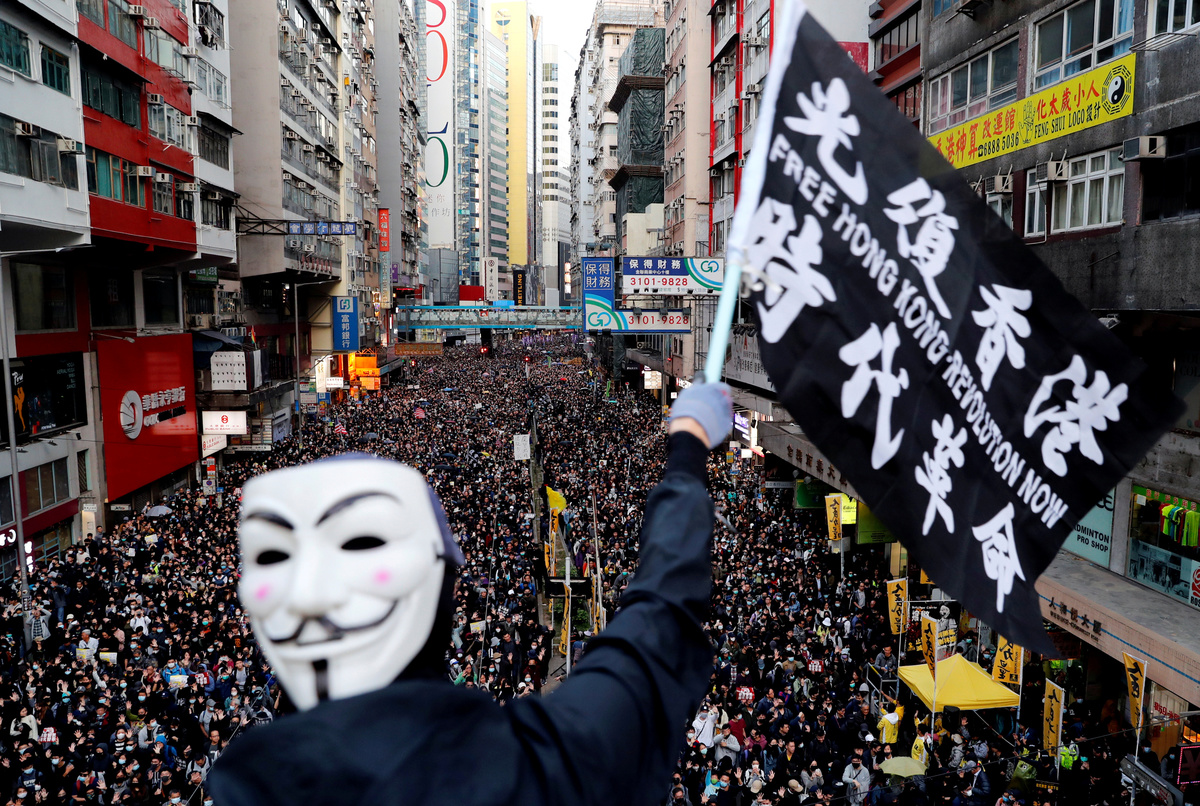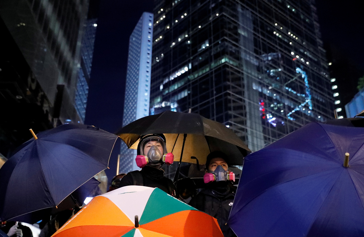 A protester raises up his hand as he holds a placard reading "Five demands, not one less!" during a Human Rights Day march, organised by the Civil Human Right Front, in Hong Kong, China December 8, 2019. REUTERS/Thomas PeterPeople walk during a Human Rights Day march, organised by the Civil Human Right Front, in Hong Kong, China December 8, 2019. Picture taken with a long exposure. REUTERS/Danish SiddiquiPeople attend a Human Rights Day march in the district of Causeway Bay in Hong Kong, China December 8, 2019. REUTERS/Laurel ChorProtesters attend a Human Rights Day march, organised by the Civil Human Right Front, in Hong Kong, China December 8, 2019. REUTERS/Danish SiddiquiA general view of protesters as they attend a Human Rights Day march, organised by the Civil Human Right Front, in Hong Kong, China December 8, 2019. REUTERS/Danish SiddiquiA protester wearing a Guy Fawkes mask waves a flag during a Human Rights Day march, organised by the Civil Human Right Front, in Hong Kong, China December 8, 2019. REUTERS/Danish SiddiquiProtesters attend a Human Rights Day march, organised by the Civil Human Right Front, in Hong Kong, China December 8, 2019. REUTERS/Danish SiddiquiProtesters hold up their hands, representing the five demands of the anti-government movement, during a Human Rights Day march, organised by the Civil Human Right Front, in Hong Kong, China December 8, 2019. REUTERS/Thomas PeterProtesters attend a Human Rights Day march, organised by the Civil Human Right Front, in Hong Kong, China December 8, 2019. REUTERS/Leah MillisProtesters attend a Human Rights Day march, organised by the Civil Human Right Front, in Hong Kong, China December 8, 2019. REUTERS/Danish SiddiquiProtesters hold up their hands representing the five demands of the anti-government movement during a Human Rights Day march, organised by the Civil Human Right Front, in Hong Kong, China December 8, 2019. REUTERS/Thomas PeterProtesters attend a Human Rights Day march, organised by the Civil Human Right Front, in Hong Kong, China December 8, 2019. REUTERS/Danish SiddiquiA protester holds up his hand, representing the five demands of the anti-government movement, during a Human Rights Day march, organised by the Civil Human Right Front, in Hong Kong, China December 8, 2019. REUTERS/Thomas PeterA riot police officer points his weapon during a Human Rights Day march, organised by the Civil Human Right Front, in Hong Kong, China December 8, 2019. REUTERS/Leah MillisPeople attend a Human Rights Day march in the district of Causeway Bay in Hong Kong, China December 8, 2019. REUTERS/Laurel ChorProtesters attend a Human Rights Day march in the district of Causeway Bay in Hong Kong, China December 8, 2019. REUTERS/Laurel ChorA protester spray paints on a roadblock during a Human Rights Day march, organised by the Civil Human Right Front, in Hong Kong, China December 8, 2019. REUTERS/Thomas Peter