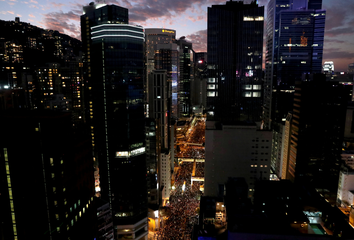 Chants of "Fight for freedom! Stand with Hong Kong!" echoed as demonstrators, from students to professionals and the elderly, marched from Victoria Park in the bustling shopping district towards the financial area.