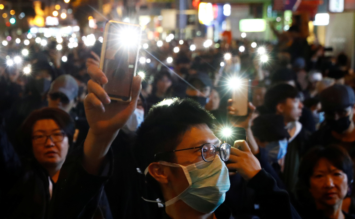 Protesters raise their mobile phones with lights on during a Human Rights Day march, organised by the Civil Human Right Front, in Hong Kong, China December 8, 2019. REUTERS/Thomas Peter