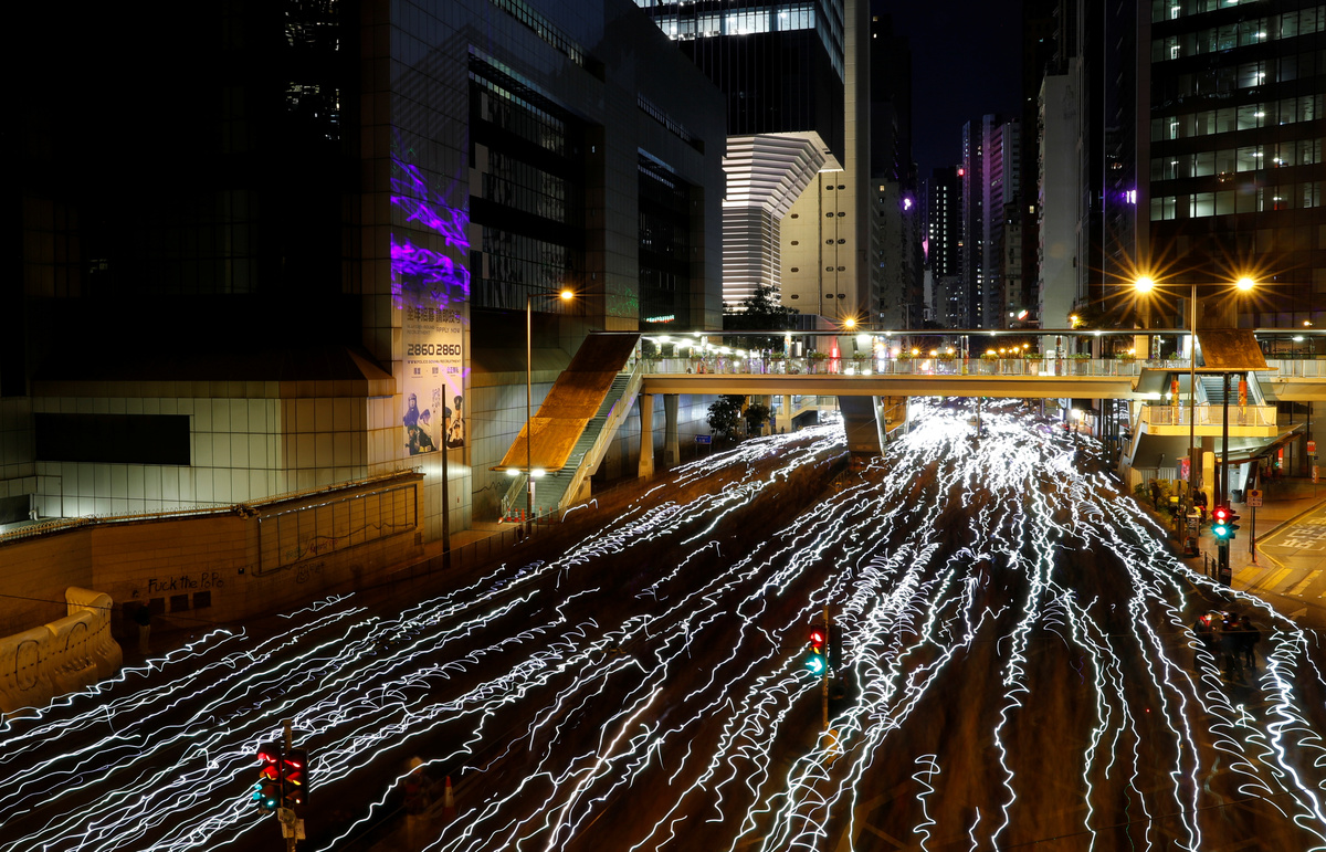 A proester holds a banner as he attends a Human Rights Day march, organised by the Civil Human Right Front, in Hong Kong, China December 8, 2019. Picture taken with a long exposure. REUTERS/Danish Siddiqui