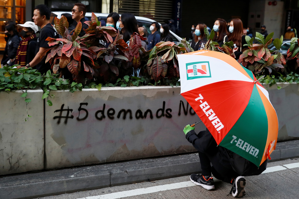 At Sunday's protest, chants of "five demands, not one less" rang out, referring to demands ranging from Lam's resignation to an amnesty for detainees.