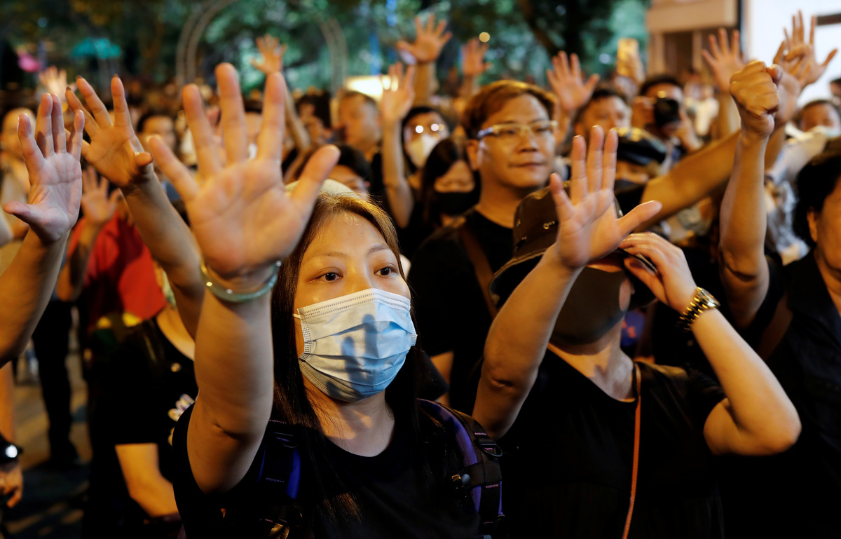 Anti-government protesters raise their hands outside the venue of the first community dialogue held by Hong Kong Chief Executive Carrie Lam in Hong Kong, China September 26, 2019. REUTERS/Athit Perawongmetha