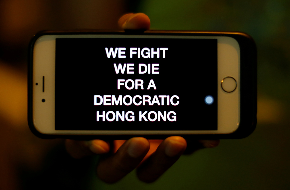 An anti-government protester's smartphone screen is pictured outside the venues of first community dialogue holding by Hong Kong Chief Executive Carrie Lam in Hong Kong, China September 26, 2019. REUTERS/Jorge Silva