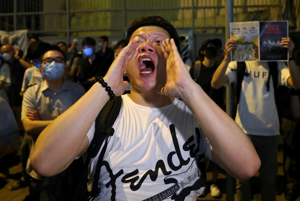 An anti-government protester shouts slogans outside the venue of the first community dialogue held by Hong Kong Chief Executive Carrie Lam in Hong Kong, China September 26, 2019. REUTERS/Athit Perawongmetha