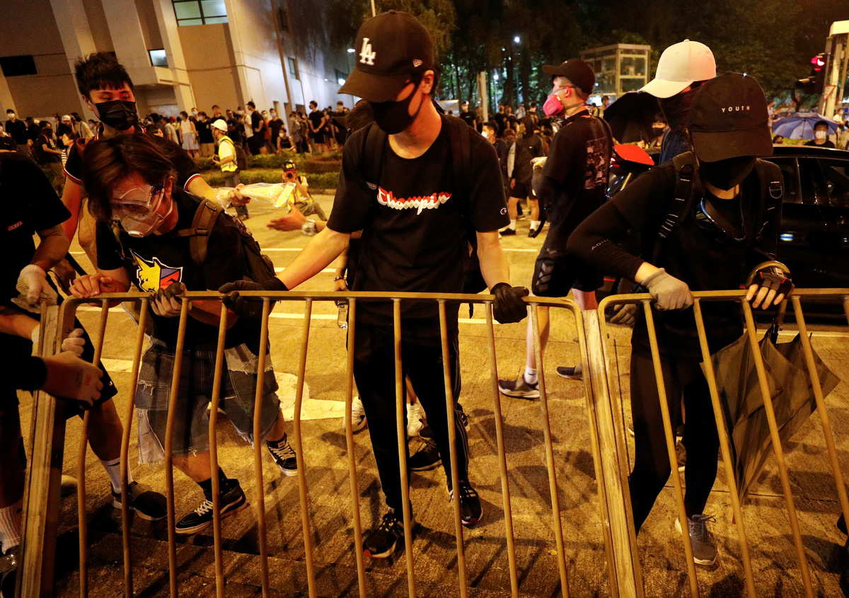 Anti-government protesters destroy fence outside the venue of first community dialogue held by Hong Kong Chief Executive Carrie Lam in Hong Kong, China September 26, 2019. REUTERS/Jorge Silva