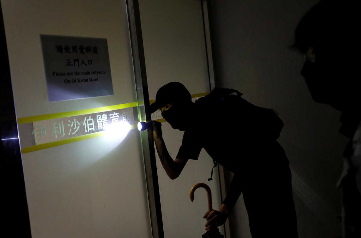 An anti-government protester with a flashlight is seen next to the back door of the venue of first community dialogue held by Hong Kong Chief Executive Carrie Lam in Hong Kong, China September 26, 2019. REUTERS/Jorge Silva