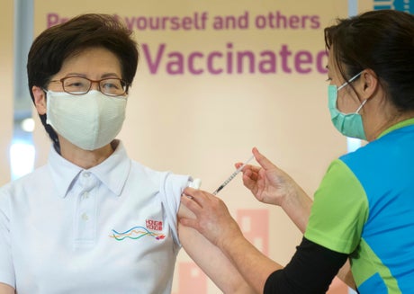Hong Kong leader Carrie Lam and other government officials received a COVID-19 vaccine Monday as the city begins its inoculation program.