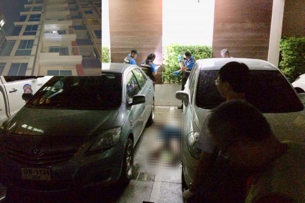 The body of the man was found lying face-down on the ground between two cars in the parking area in front of one of the three 8-storey condominium buildings on Soi Ratchada 20 in Samsen Nok area of Huai Kwang district, said Pol Lt Phollawat Wisomka, deputy investigation chief at Sutthisan police station. The incident was reported at around 10.30pm on Thursday.