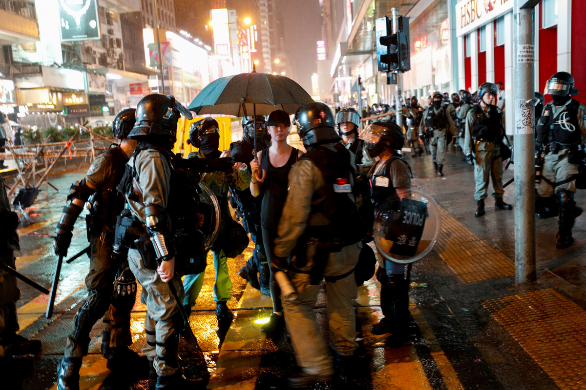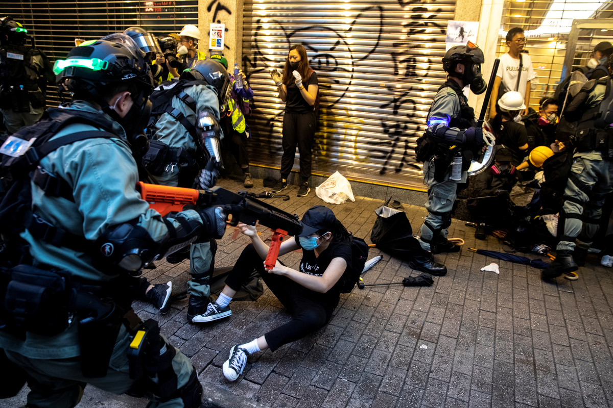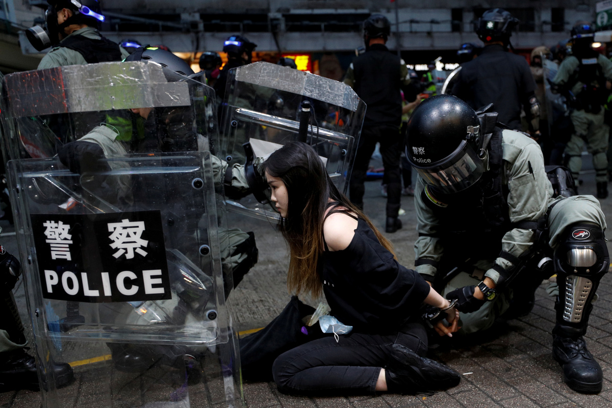 Police made their first arrests under the new rules, detaining scores of people. Officers tied their wrists with cable and unmasked their faces before placing them on buses. Some protesters lay in foetal positions on the ground, their wrists tied behind their backs, after being subdued with pepper spray and batons.