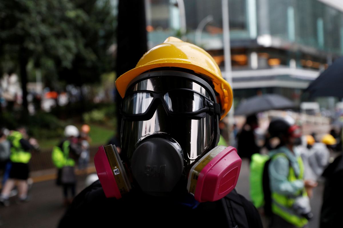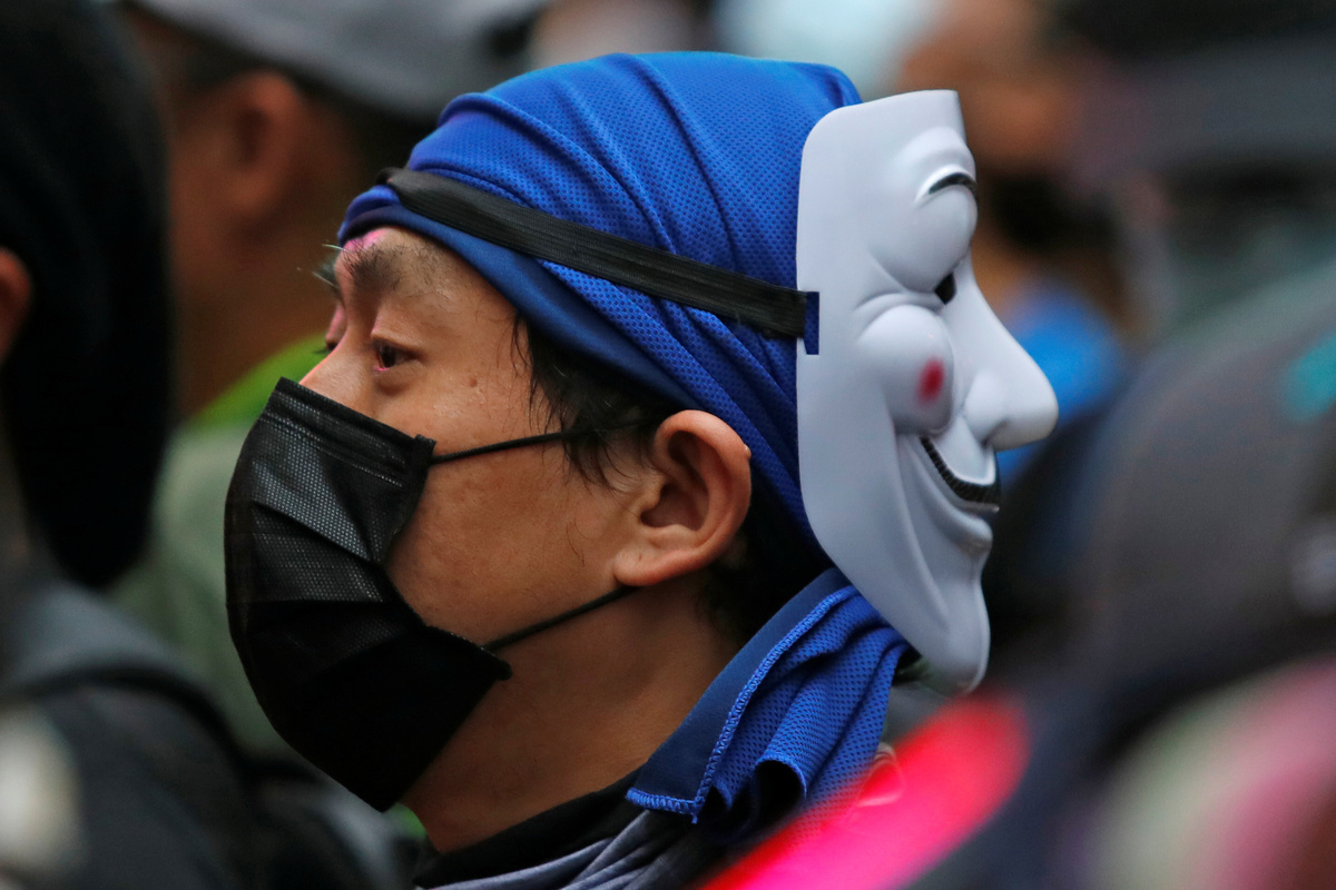 Protesters concealed their faces in defiance of colonial-era emergency laws invoked by the authorities on Friday, which banned face masks. Protesters face a maximum of one year in jail for breaking the mask ban.