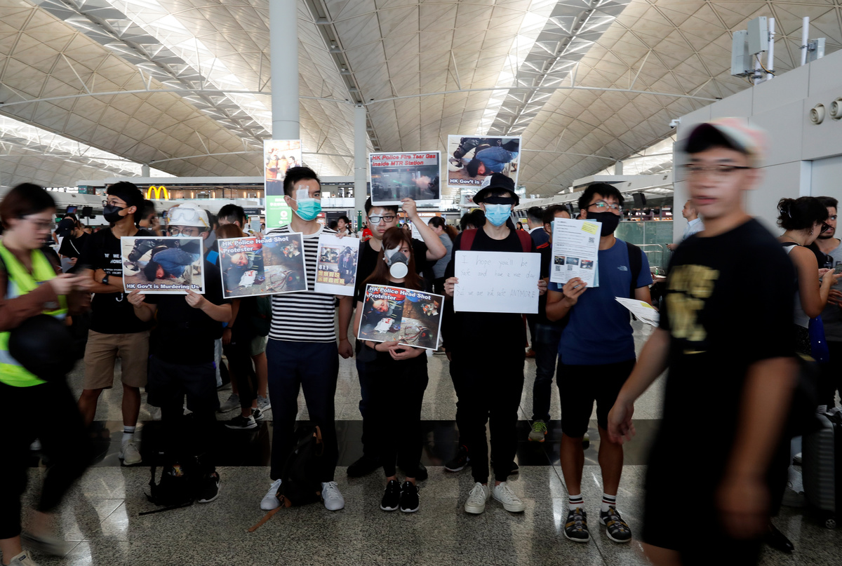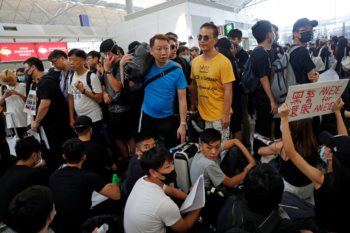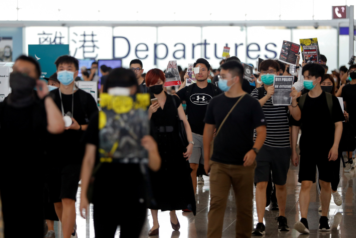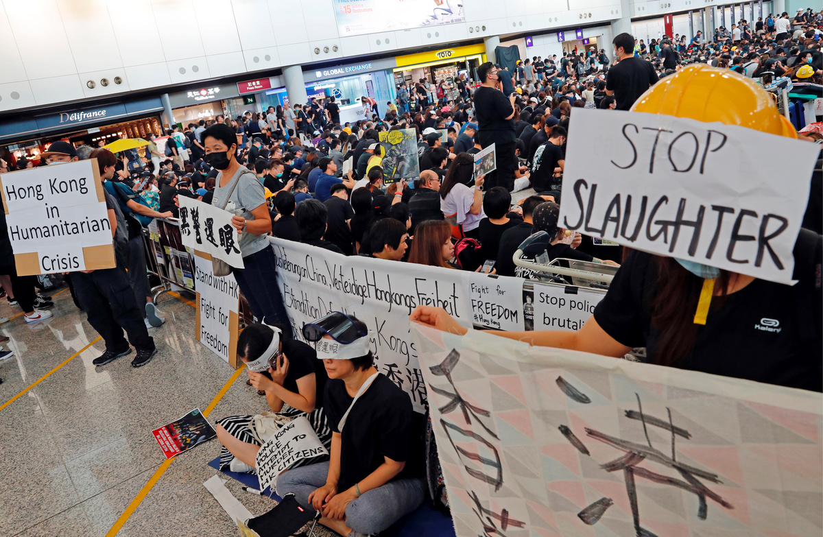 The mostly young black-clad protesters have chanted slogans such as "No rioters, only tyranny!" and "Liberate Hong Kong!" while approaching travellers with flyers describing their demands and explaining the unrest.