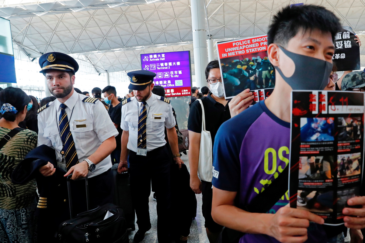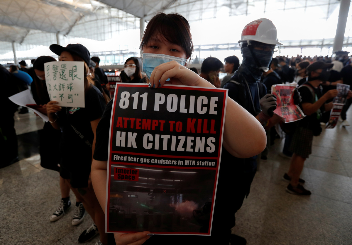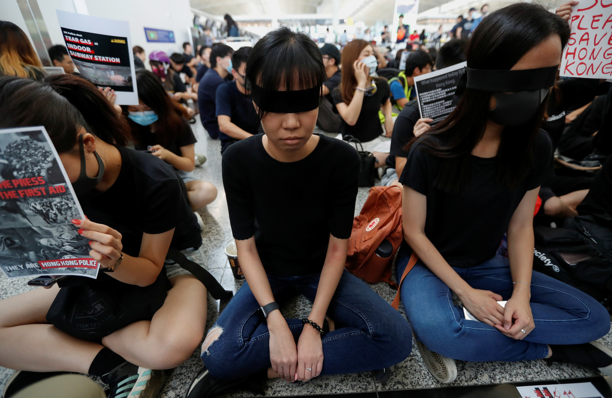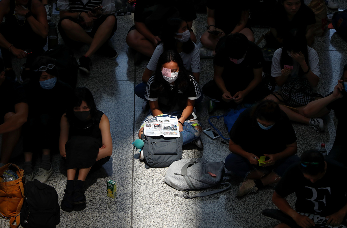 The mostly young black-clad protesters have chanted slogans such as "No rioters, only tyranny!" and "Liberate Hong Kong!" while approaching travellers with flyers describing their demands and explaining the unrest.