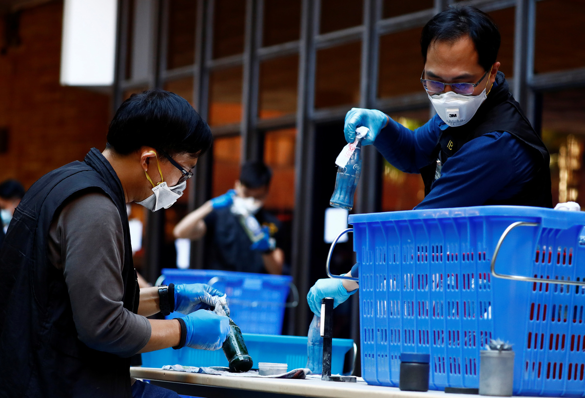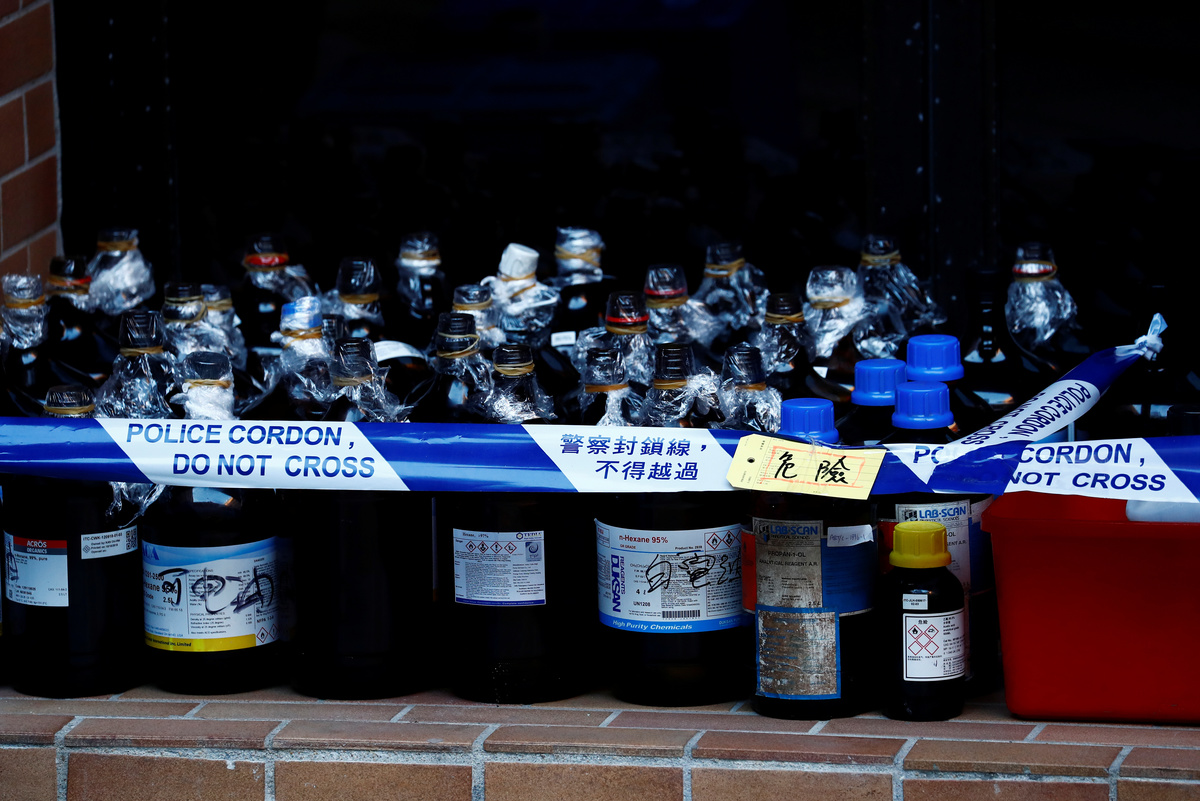 Before police left, they seized nearly 4,000 Molotov cocktails and hundreds of bottles of chemicals, Kwok said.