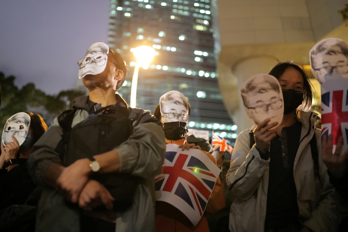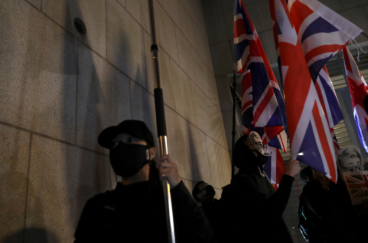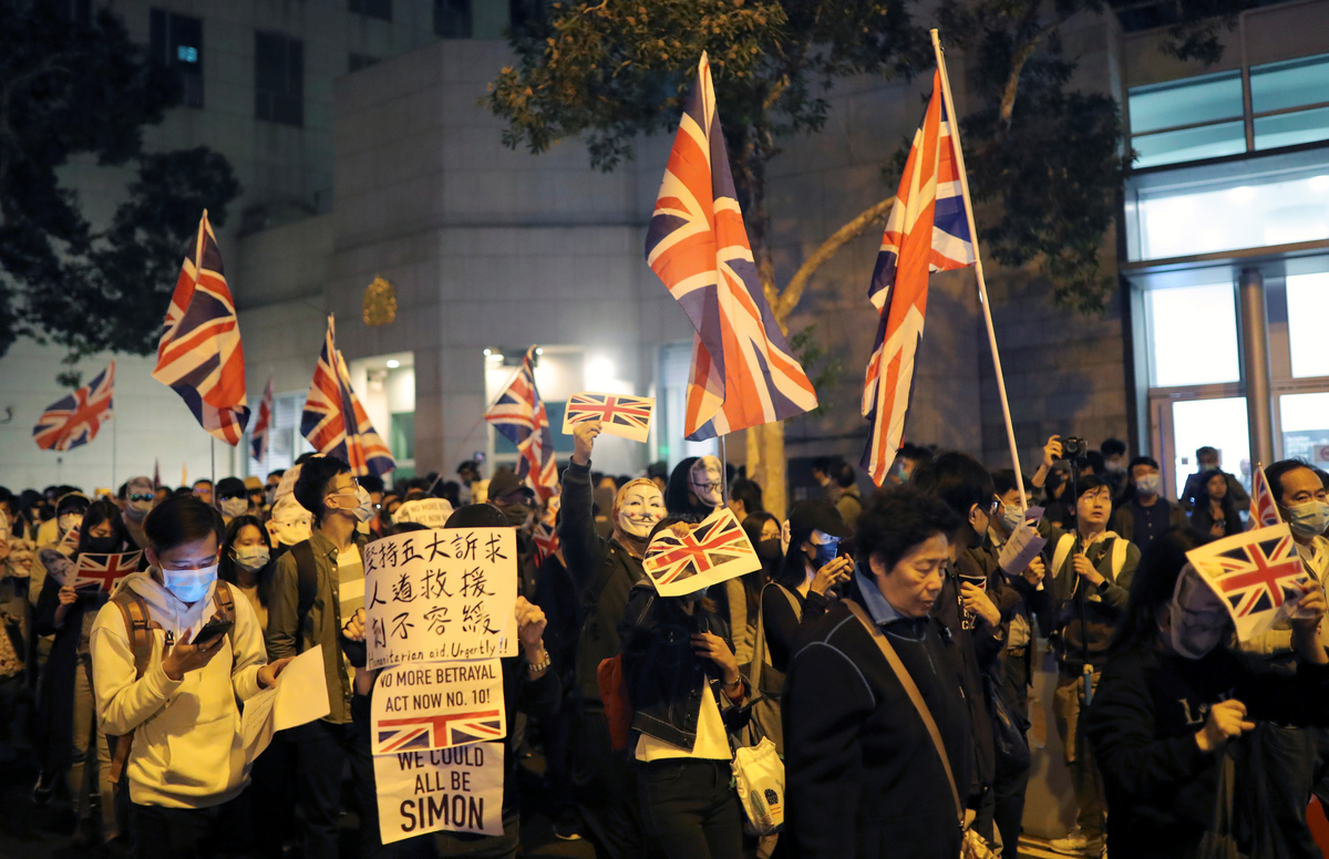 A few hundred protesters, some carrying Union Jack flags, gathered at the British consulate on Friday urging London to extend citizenship to Hong Kong residents born before the 1997 handover to China and classified as overseas British nationals.