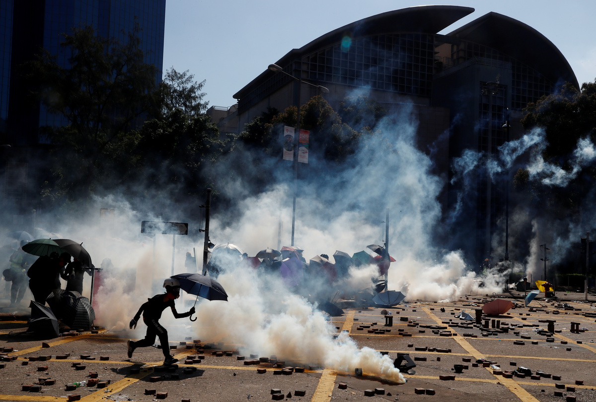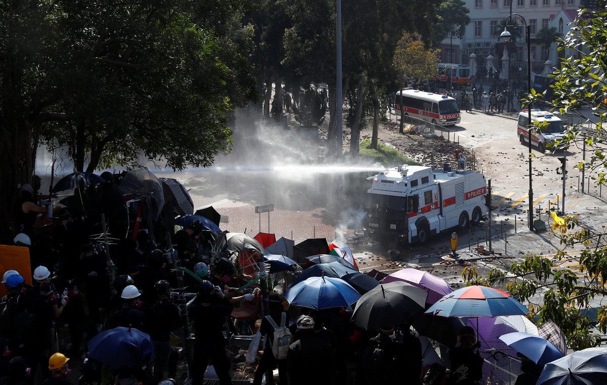 HONG KONG (Reuters) - Hong Kong protesters shot arrows and hurled petrol bombs from a barricaded university on Sunday at police who fired tear gas and water cannon in some of the worst violence in the Chinese-ruled city since anti-government unrest erupted five months ago.