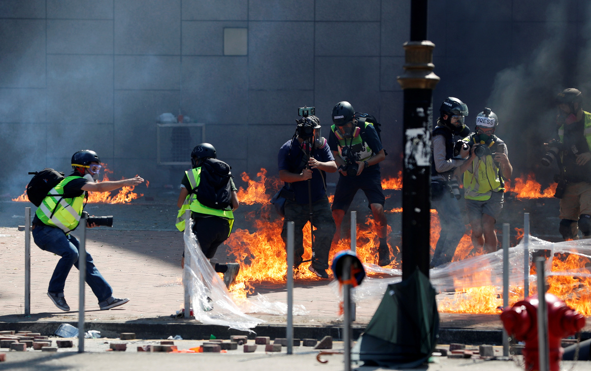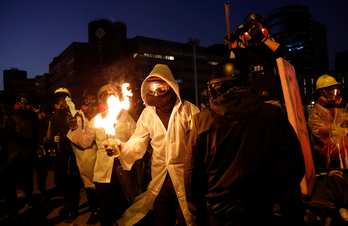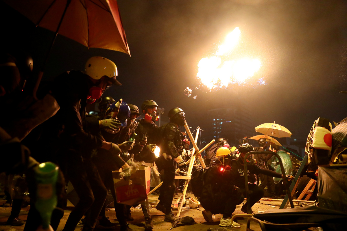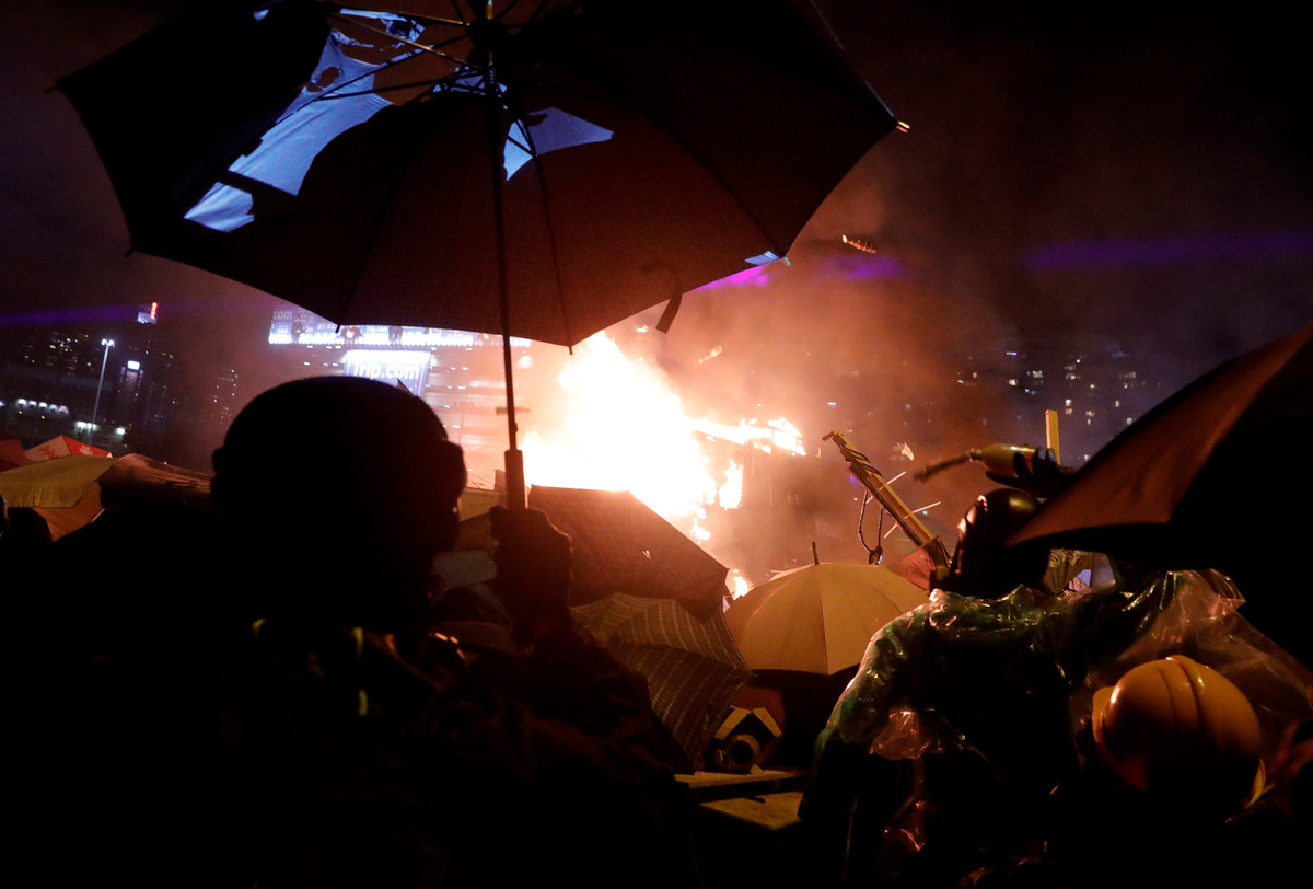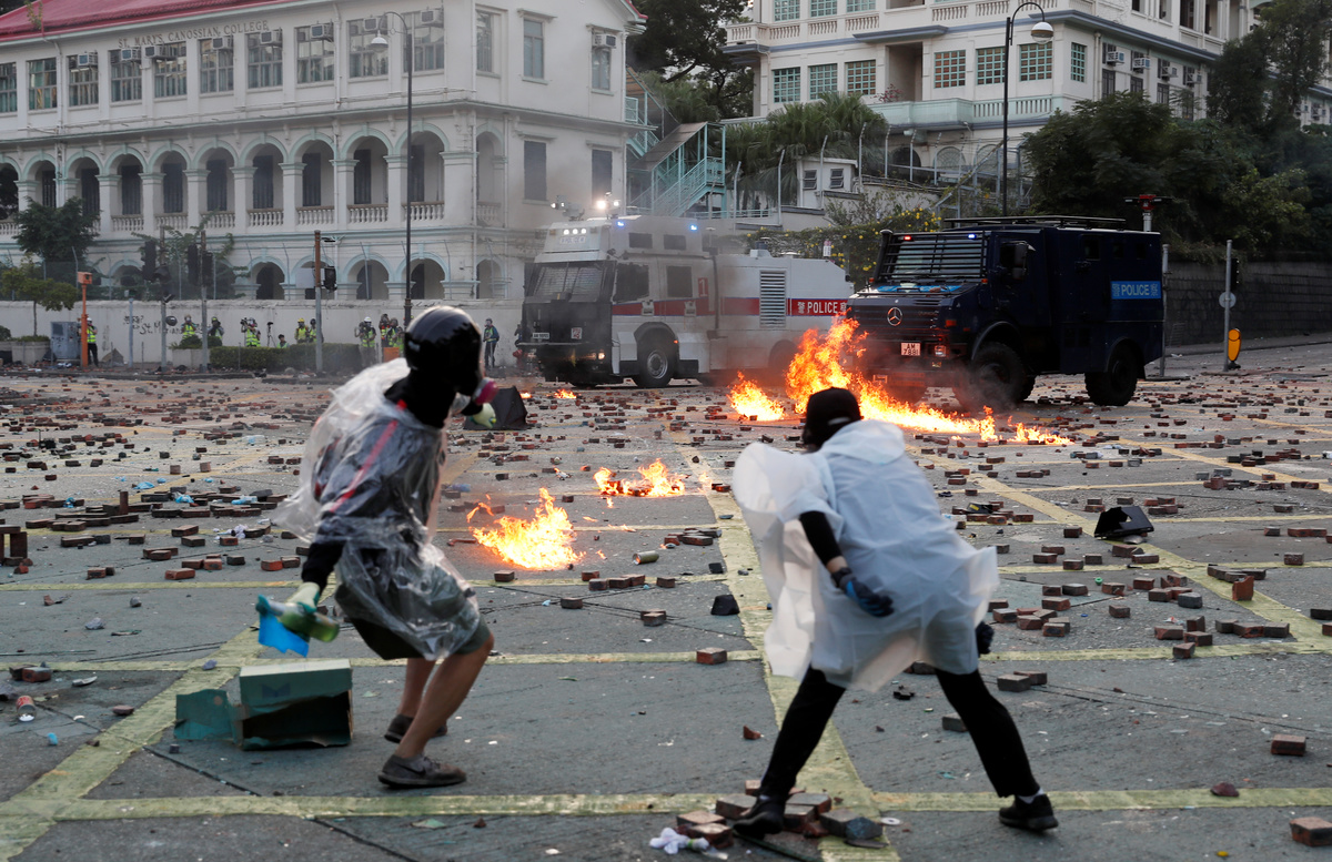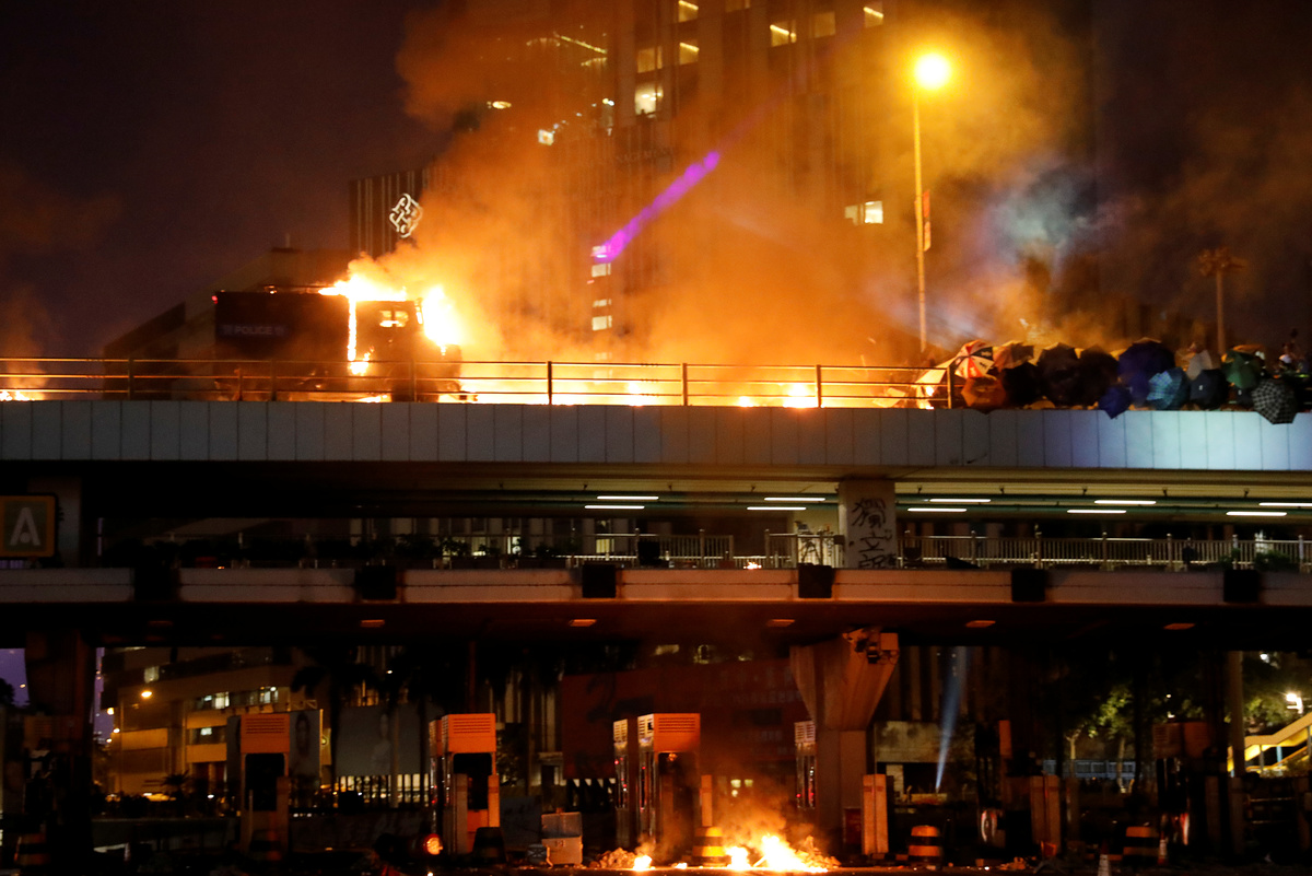 Protesters throw Molotov cocktails at a police armoured truck, which tried to ram the barricade at a bridge above the entrance to the Cross Harbour Tunnel during clashes outside Hong Kong Polytechnic University (PolyU) in Hong Kong, China November 17, 2019. REUTERS/Thomas PeterAnti-government protesters prepare molotov cocktails during clashes with police, outside Hong Kong Polytechnic University (PolyU) in Hong Kong, China, November 17, 2019. REUTERS/Athit PerawongmethaAnti-government protesters take cover during clashes with police, outside Hong Kong Polytechnic University (PolyU) in Hong Kong, China, November 17, 2019. REUTERS/Athit PerawongmethaA police vehicle catches fire after being hit with molotov cocktails, as anti-government protesters clash with police, outside Hong Kong Polytechnic University (PolyU) in Hong Kong, China, November 17, 2019. REUTERS/Athit PerawongmethaProtesters throw Molotov cocktails at a police armoured truck, which tried to ram the barricade at a bridge above the entrance to the Cross Harbour Tunnel during clashes outside Hong Kong Polytechnic University (PolyU) in Hong Kong, China November 17, 2019. REUTERS/Thomas PeterAnti-government protesters take cover during clashes with police, outside Hong Kong Polytechnic University (PolyU) in Hong Kong, China, November 17, 2019. REUTERS/Athit PerawongmethaA protester's umbrella catches on fire during clashes with police outside Hong Kong Polytechnic University (PolyU) in Hong Kong, China November 17, 2019. REUTERS/Adnan Abidi Police armoured truck burns as it was hit with Molotov cocktails, after an attempt to ram the barricade at a bridge above the entrance to the Cross Harbour Tunnel during clashes outside Hong Kong Polytechnic University (PolyU) in Hong Kong, China November 17, 2019. REUTERS/Adnan AbidiProtester block the bridge above the Cross Harbour Tunnel as clashes with police continue outside Hong Kong Polytechnic University (PolyU) in Hong Kong, China November 17, 2019. REUTERS/Adnan AbidiA protester moves a burning barricade during clashes with police outside Hong Kong Polytechnic University (PolyU) in Hong Kong, China November 17, 2019. REUTERS/Thomas PeterProtesters are sprayed with blue liquid from water cannon during clashes with police outside Hong Kong Polytechnic University (PolyU) in Hong Kong, China November 17, 2019. REUTERS/Thomas PeterJournalists react as fire from Molotov cocktail burns next to them as protesters clash with police outside Hong Kong Polytechnic University (PolyU) in Hong Kong, China November 17, 2019. REUTERS/Adnan AbidiA protester stand at a checkpoint on a barricade during clashes with police outside Hong Kong Polytechnic University (PolyU) in Hong Kong, China November 17, 2019. REUTERS/Adnan AbidiPolice uses a water cannon against protesters during clashes outside Hong Kong Polytechnic University (PolyU) in Hong Kong, China November 17, 2019. REUTERS/Thomas PeterProtesters clash with police outside Hong Kong Polytechnic University (PolyU) in Hong Kong, China November 17, 2019. REUTERS/Thomas Peter A protester hides behind a shield during clashes with police outside Hong Kong Polytechnic University (PolyU) in Hong Kong, China November 17, 2019. REUTERS/Adnan AbidiA protester rests as clashes continue with police outside, at Hong Kong Polytechnic University (PolyU) in Hong Kong, China November 17, 2019. REUTERS/Adnan AbidiProtesters wear gas masks during clashes with police outside Hong Kong Polytechnic University (PolyU) in Hong Kong, China November 17, 2019. REUTERS/Thomas Peter