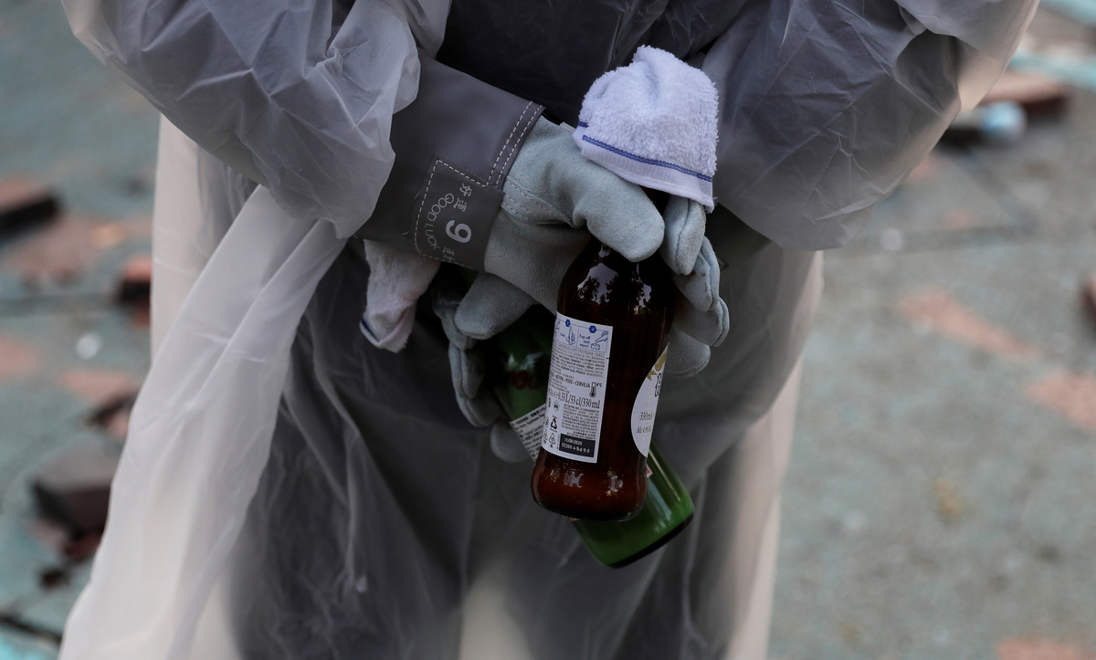 An anti-government protester holds bottles during clashes with police, outside Hong Kong Polytechnic University (PolyU) in Hong Kong, China, November 17, 2019. REUTERS/Tyrone Siu