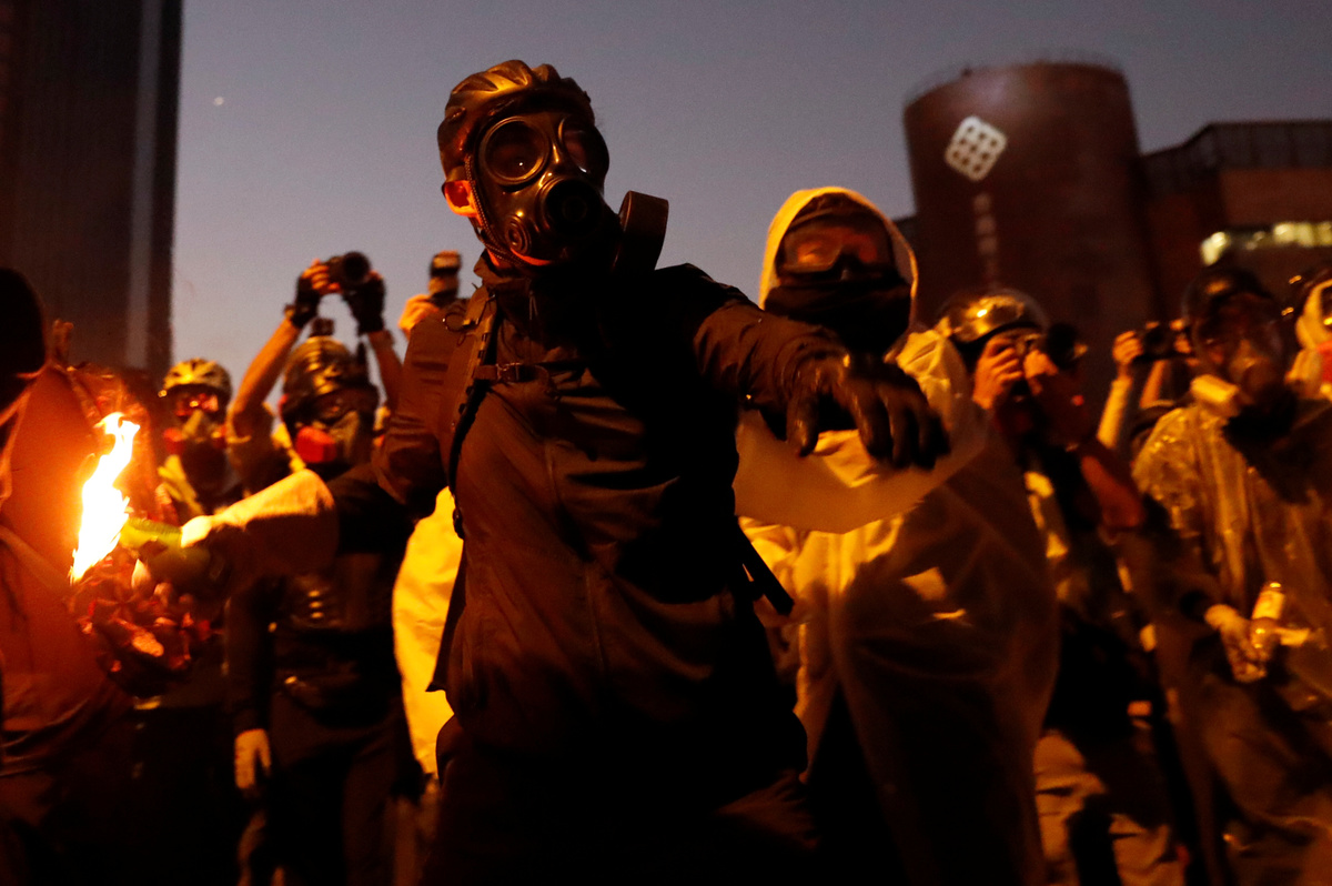 Anti-government protesters wear gas masks during clashes with police, outside Hong Kong Polytechnic University (PolyU) in Hong Kong, China, November 17, 2019. REUTERS/Tyrone Siu