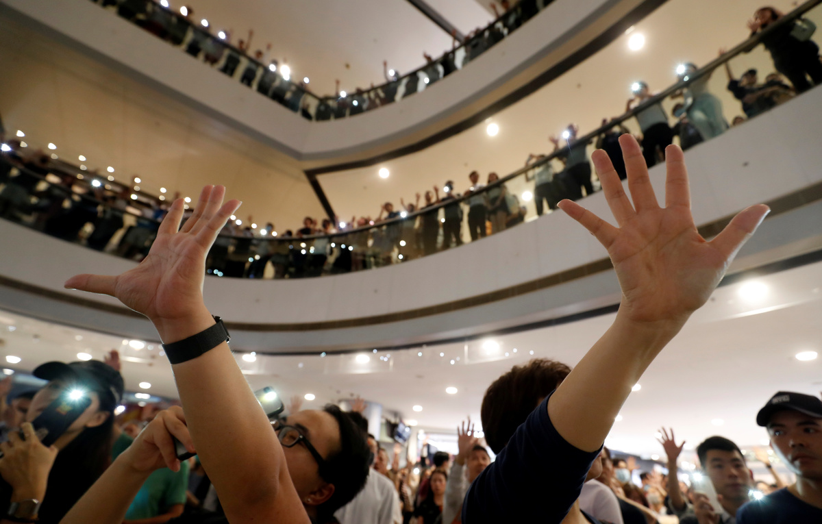 Anti-government protesters gathered there again after office hours, chanting "five demands, not one less" and "add oil, Hong Kong people", a phrase meaning keep drawing strength that has become a rallying cry of the protest movement.