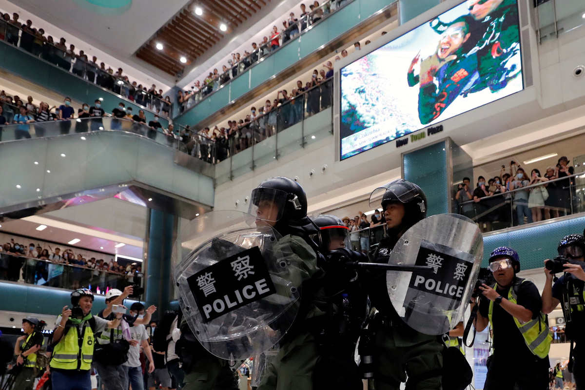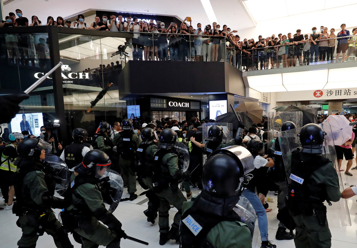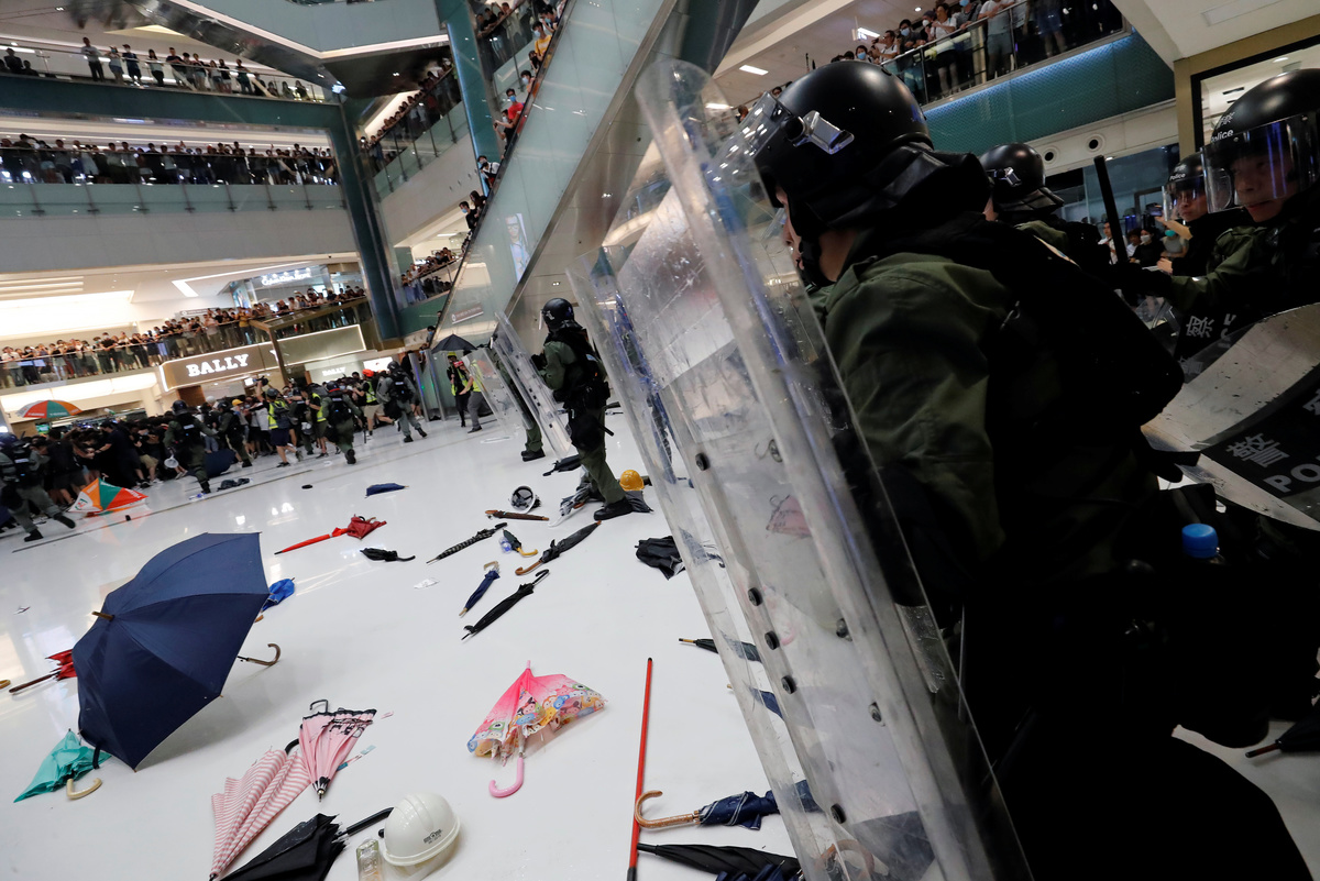 Clashes broke out as protesters hurled umbrellas and plastic bottles at police who retaliated by firing pepper spray amid chaotic scenes inside a shopping mall that houses some of the world's biggest luxury brands.