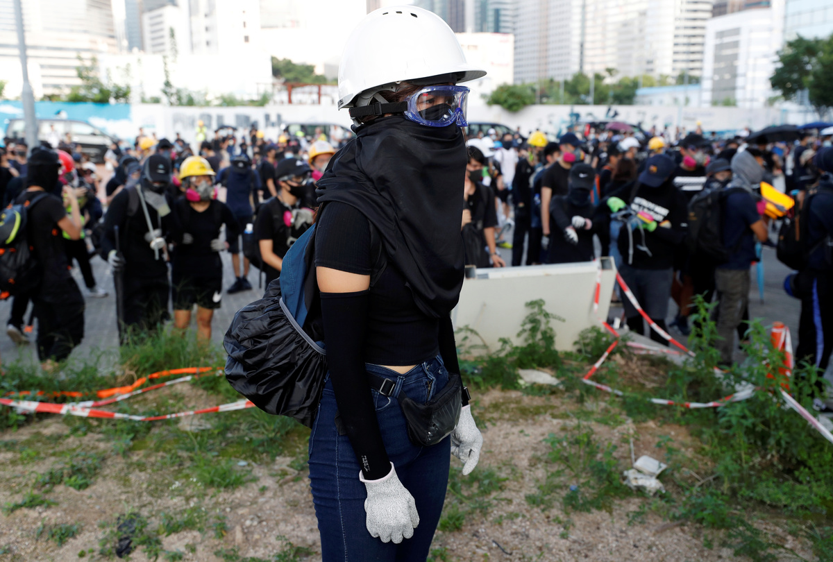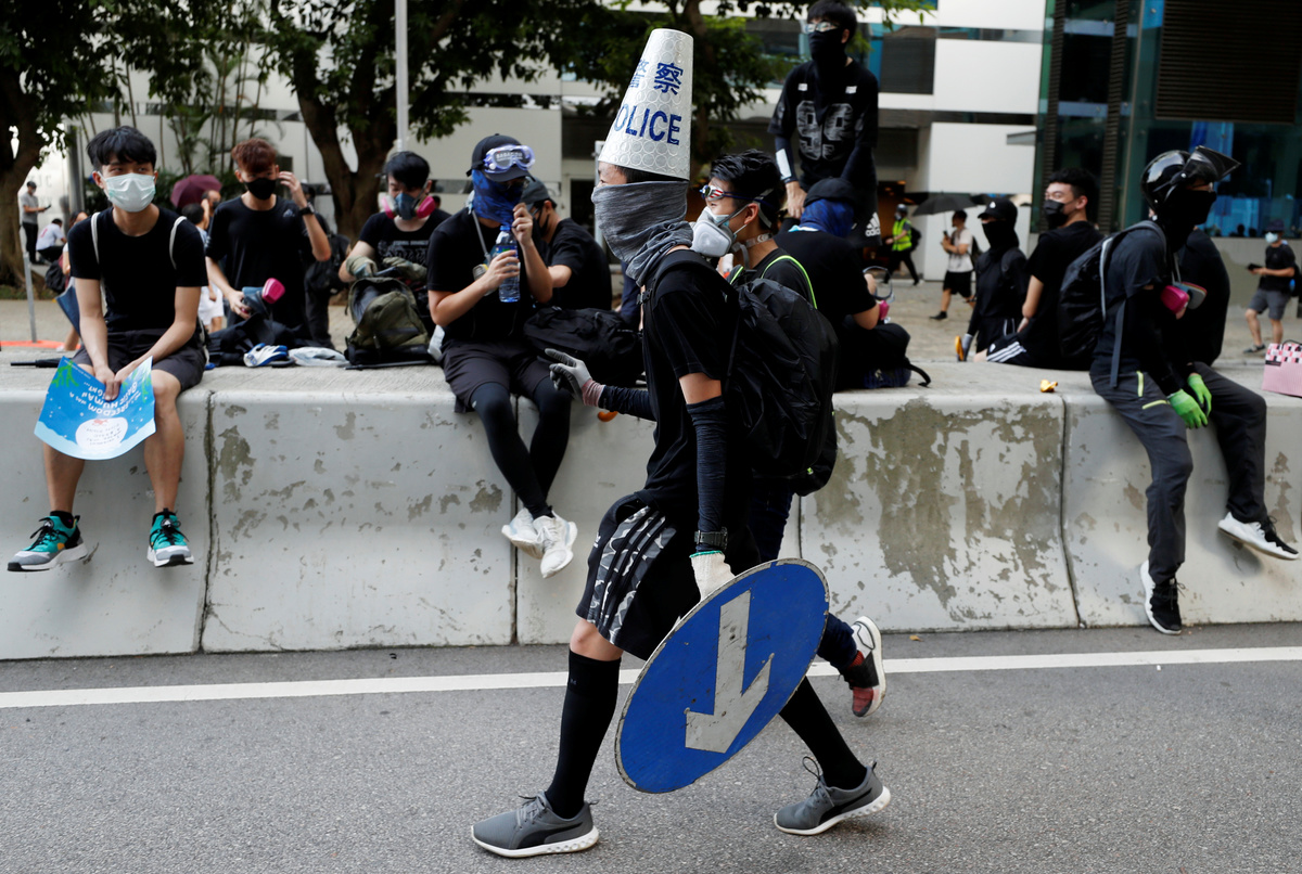 Some protesters threw bricks at police outside the Chinese People's Liberation Army base in the city's Admiralty district, and tore down and set fire to a red banner proclaiming the 70th anniversary on Oct. 1 of the founding of the People's Republic of China, in a direct challenge to Beijing.