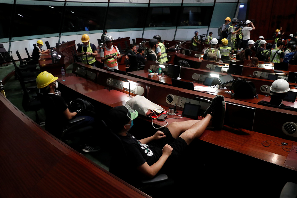 HONG KONG (Reuters) - Chaotic scenes of protesters rampaging through Hong Kong's legislature, trashing furniture and daubing graffiti over walls have sent jitters through the business community, which worries about the impact on the city's status as a financial hub.
