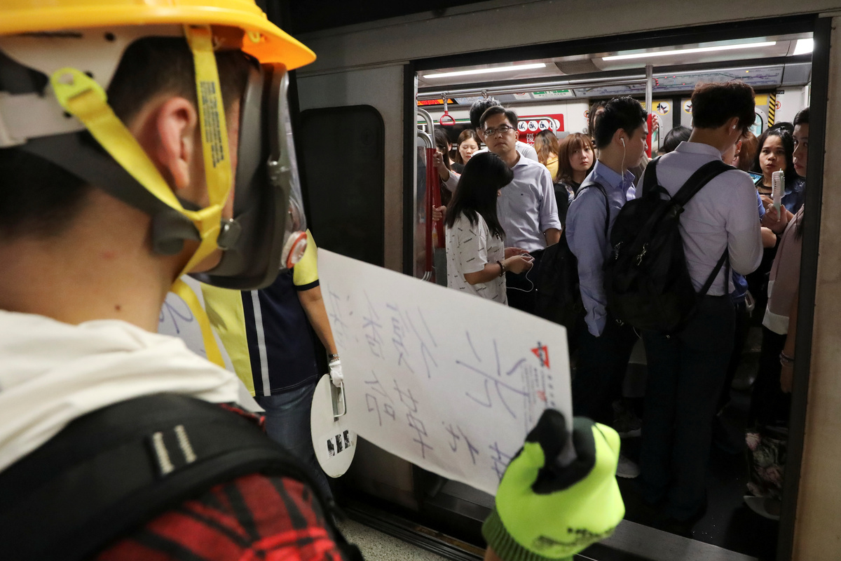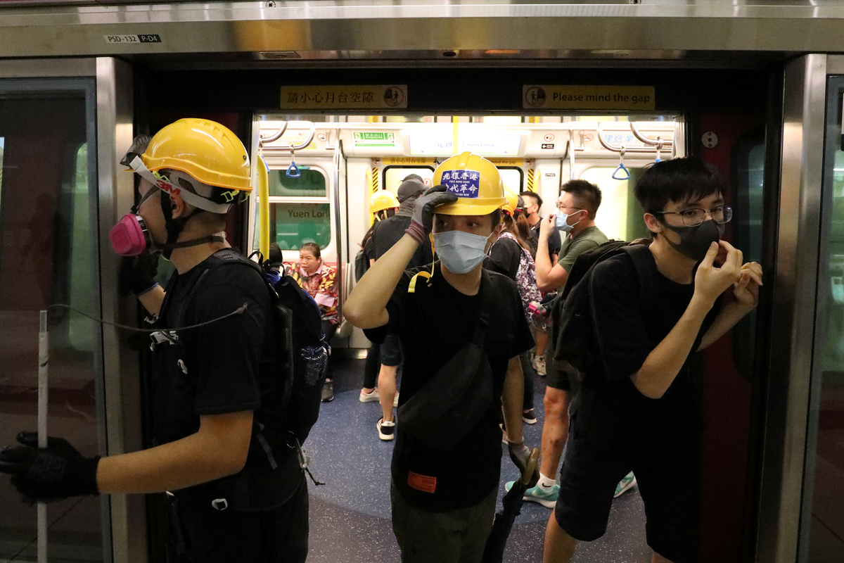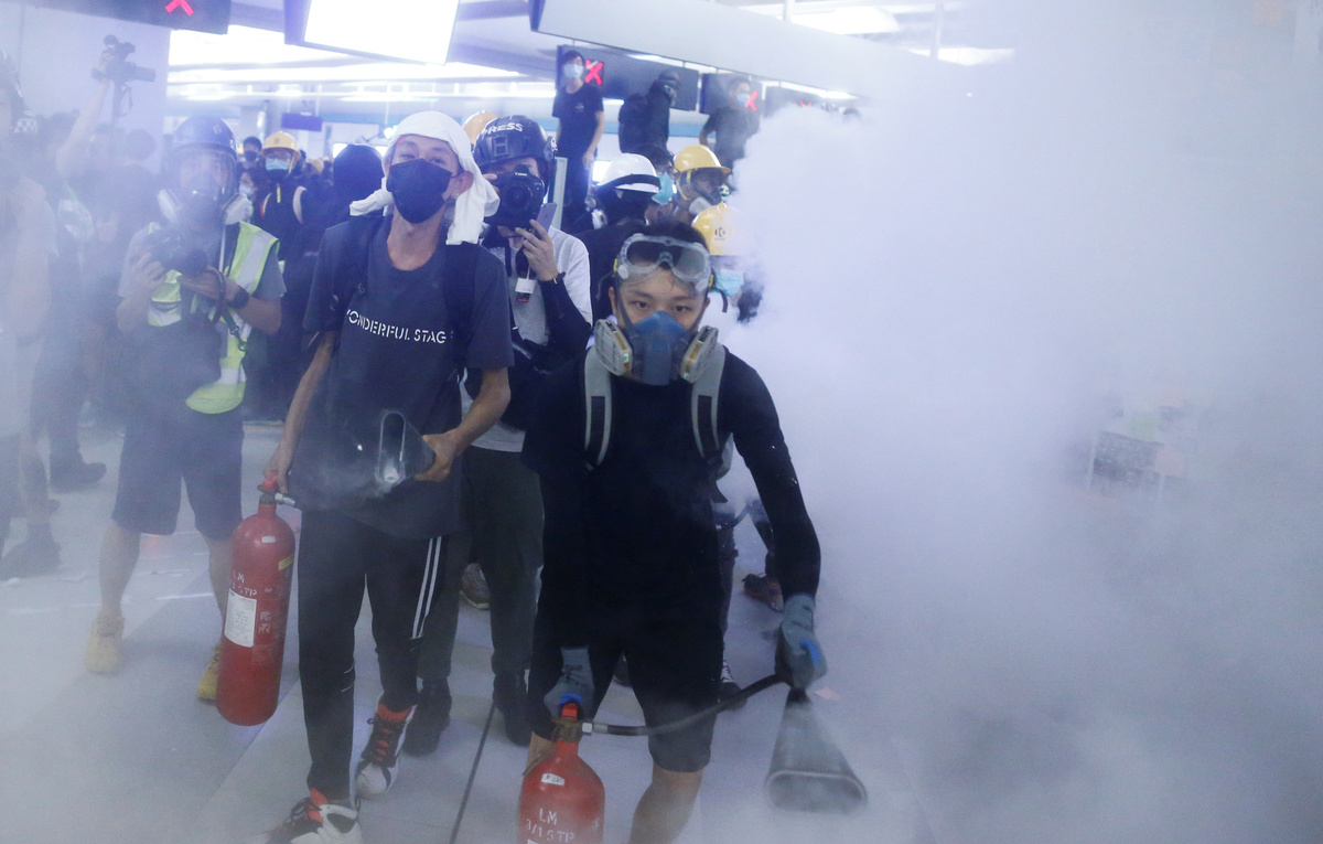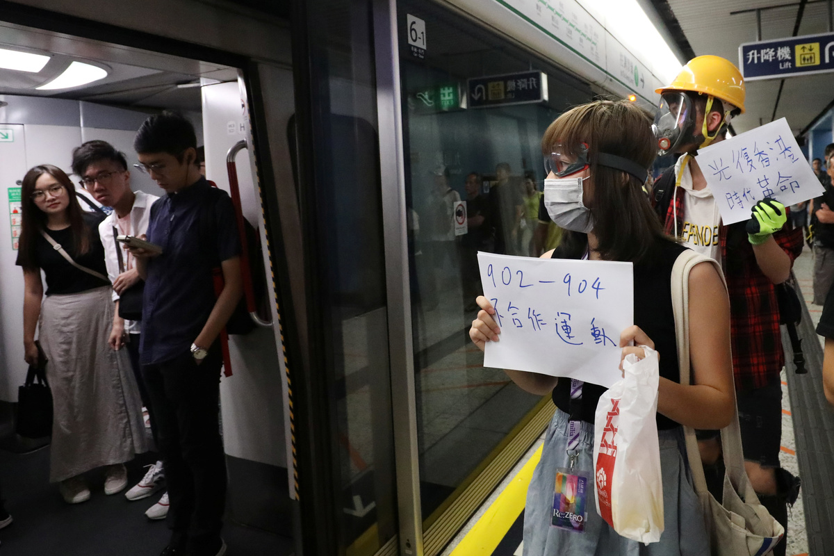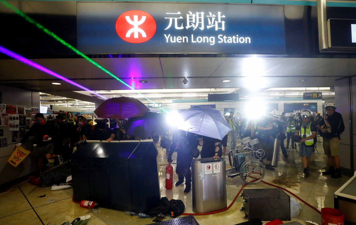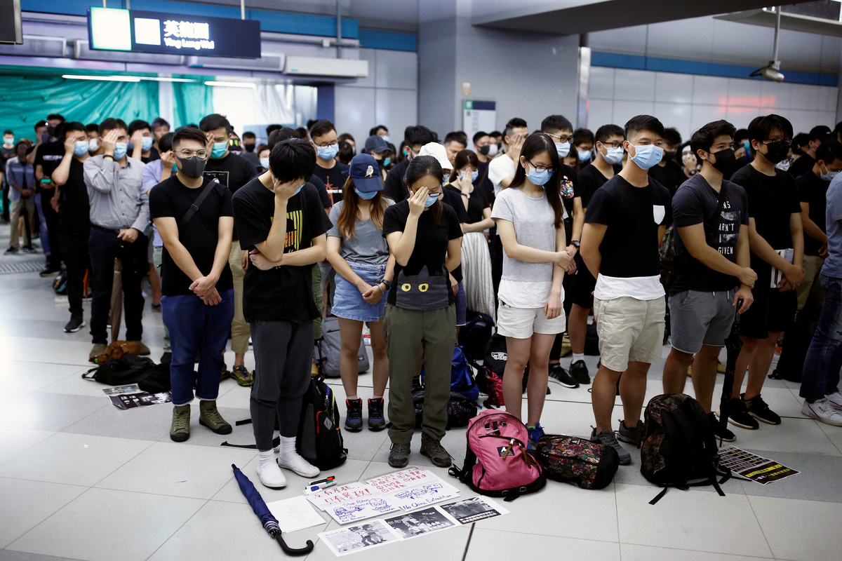 Protesters call people to join further rallies against the government at Kowloon Tong subway station in Hong Kong, China, August 21, 2019. REUTERS/Ann WangProtesters face riot police during a stand off at Yuen Long MTR station, the scene of an attack by suspected triad gang members a month ago, in Yuen Long, New Territories, Hong Kong, China August 21, 2019. REUTERS/Kai PfaffenbachProtesters face riot police inside the Yuen Long MTR station, the scene of an attack by suspected triad gang members a month ago, in Yuen Long, New Territories, Hong Kong, China August 21, 2019. REUTERS/Willy KurniawanProtesters fire nitrogen extinguishers during a stand off at Yuen Long MTR station, the scene of an attack by suspected triad gang members a month ago, in Yuen Long, New Territories, Hong Kong, China August 21, 2019. REUTERS/Thomas PeterProtesters fire nitrogen extinguishers during a stand off at Yuen Long MTR station, the scene of an attack by suspected triad gang members a month ago, in Yuen Long, New Territories, Hong Kong, China August 21, 2019. REUTERS/Thomas PeterA protester fires a nitrogen extinguisher during a stand off at Yuen Long MTR station, the scene of an attack by suspected triad gang members a month ago, in Yuen Long, New Territories, Hong Kong, China August 21, 2019. REUTERS/Thomas PeterProtesters fire nitrogen extinguishers toward riot police during a stand off at Yuen Long MTR station, the scene of an attack by suspected triad gang members a month ago, in Yuen Long, New Territories, Hong Kong, China August 21, 2019. REUTERS/Kai PfaffenbachProtesters face riot police during a stand off at Yuen Long MTR station, the scene of an attack by suspected triad gang members a month ago, in Yuen Long, New Territories, Hong Kong, China August 21, 2019. REUTERS/Kai PfaffenbachProtesters face riot police inside the Yuen Long MTR station, the scene of an attack by suspected triad gang members a month ago, in Yuen Long, New Territories, Hong Kong, China August 21, 2019. REUTERS/Tyrone SiuProtesters fire nitrogen extinguishers toward riot police during a stand off at Yuen Long MTR station, the scene of an attack by suspected triad gang members a month ago, in Yuen Long, New Territories, Hong Kong, China August 21, 2019. REUTERS/Kai PfaffenbachPeople protest during a silent sit-in gathering at Yuen Long MTR station, the scene of an attack by suspected triad gang members a month ago, in Yuen Long, New Territories, Hong Kong, China August 21, 2019. REUTERS/Tyrone SiuProtesters fire nitrogen extinguishers toward riot police during a stand off at Yuen Long MTR station, the scene of an attack by suspected triad gang members a month ago, in Yuen Long, New Territories, Hong Kong, China August 21, 2019. REUTERS/Kai PfaffenbachA person walks past police members who are patrolling during a silent sit-in gathering at Yuen Long MTR station, the scene of an attack by suspected triad gang members a month ago, in Yuen Long, New Territories, Hong Kong, China August 21, 2019. REUTERS/Kai PfaffenbachPolice members patrol as people protest during a silent sit-in gathering outside Yuen Long MTR station, the scene of an attack by suspected triad gang members a month ago, in Yuen Long, New Territories, Hong Kong, China August 21, 2019. REUTERS/Tyrone Siu ?People protest during a silent sit-in gathering at Yuen Long MTR station, the scene of an attack by suspected triad gang members a month ago, in Yuen Long, New Territories, Hong Kong, China August 21, 2019. REUTERS/Thomas PeterProtesters gather after firing nitrogen extinguishers towards the riot police during a stand off at Yuen Long MTR station, the scene of an attack by suspected triad gang members a month ago, in Yuen Long, New Territories, Hong Kong, China August 21, 2019. REUTERS/Kai Pfaffenbach