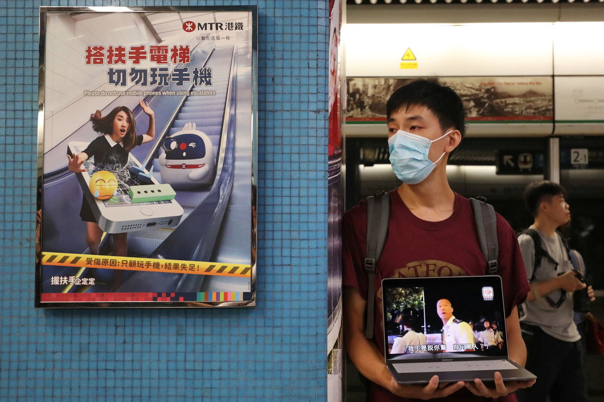 A protester calls people to join further rallies against the government and plays a video of police brutality at Kowloon Tong subway station in Hong Kong, China, August 21, 2019. REUTERS/Ann Wang