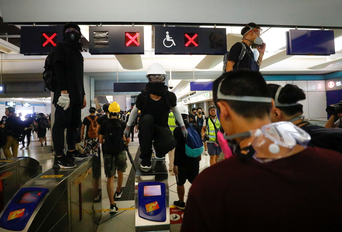 Protesters stand around a fare gate inside Yuen Long MTR station, the scene of an attack by suspected triad gang members a month ago, in Yuen Long, New Territories, Hong Kong, China August 21, 2019. REUTERS/Ann Wang