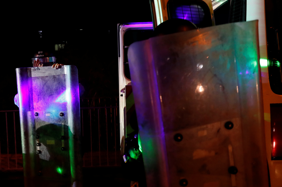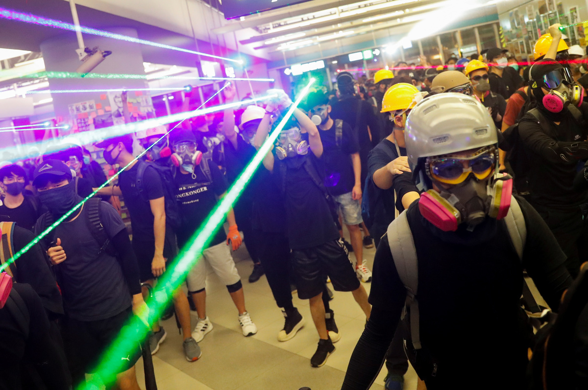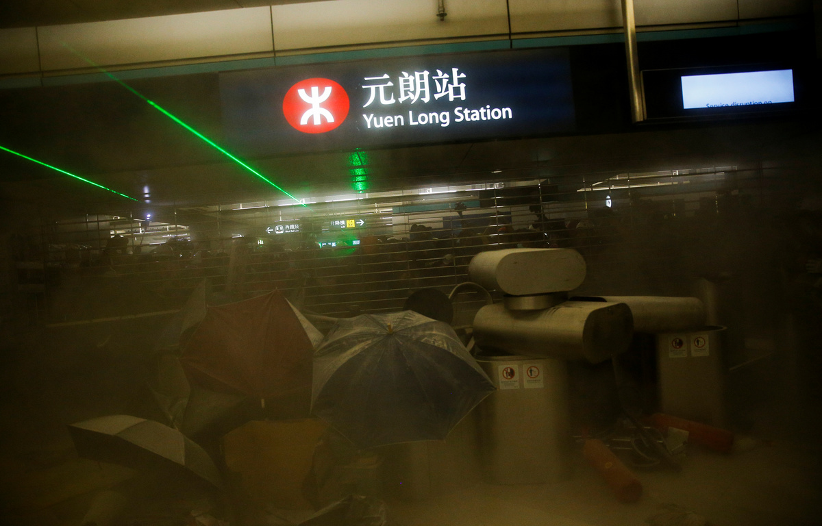 Some blocked station exits with bins, booths and other station furniture as others sealed roads outside the station, aiming green laser beams at the lines of shield-bearing officers. Others threw empty fire extinguishers at police lines.