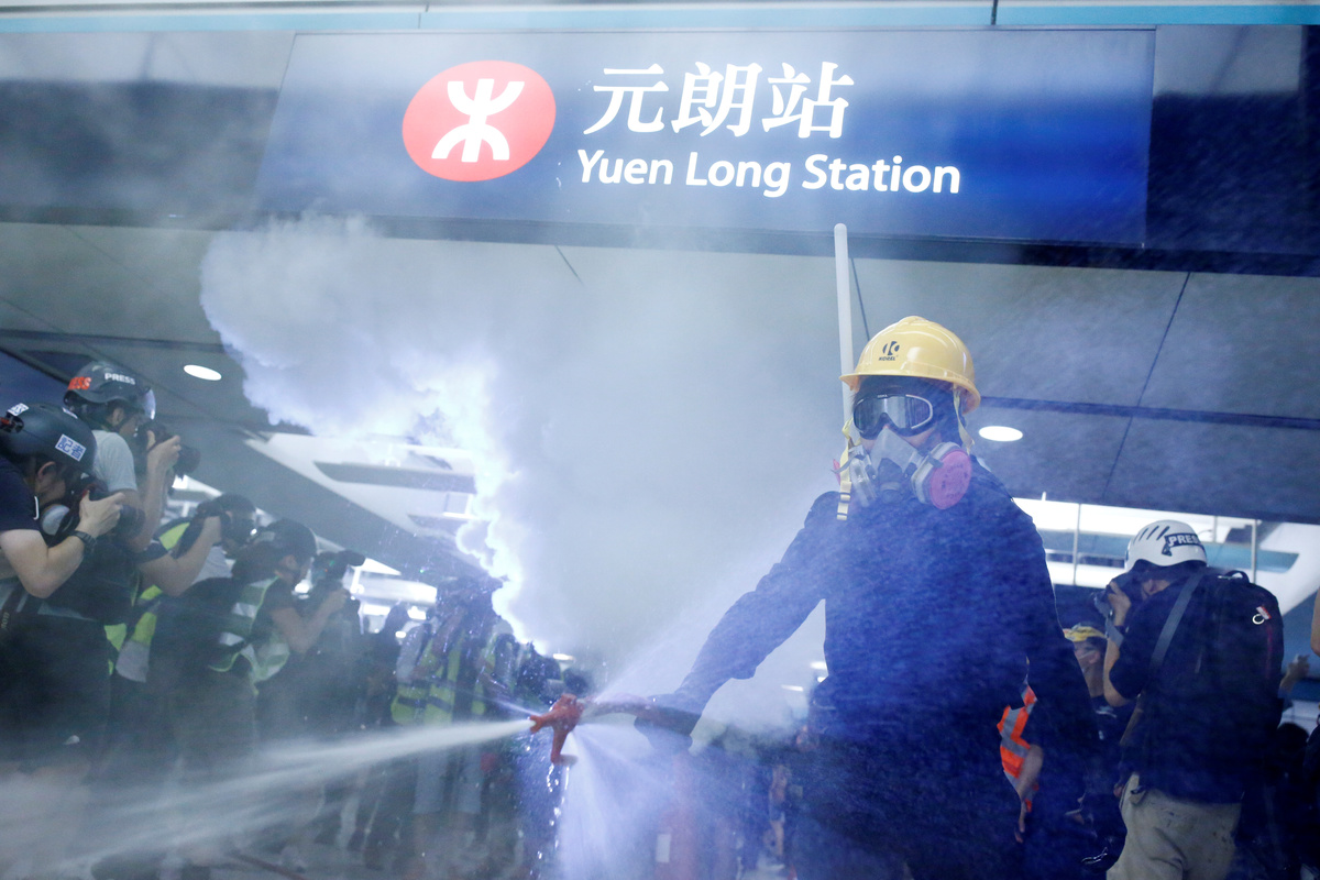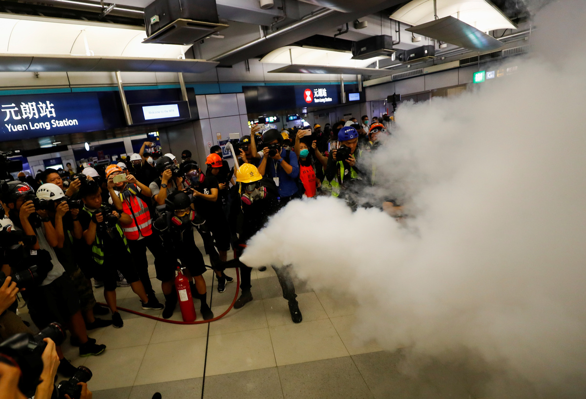 Some masked protesters clashed with police, spraying fire extinguishers from the inside of Yuen Long station as others smeared the floor with cooking oil, beer and detergent to stop the police advancing.