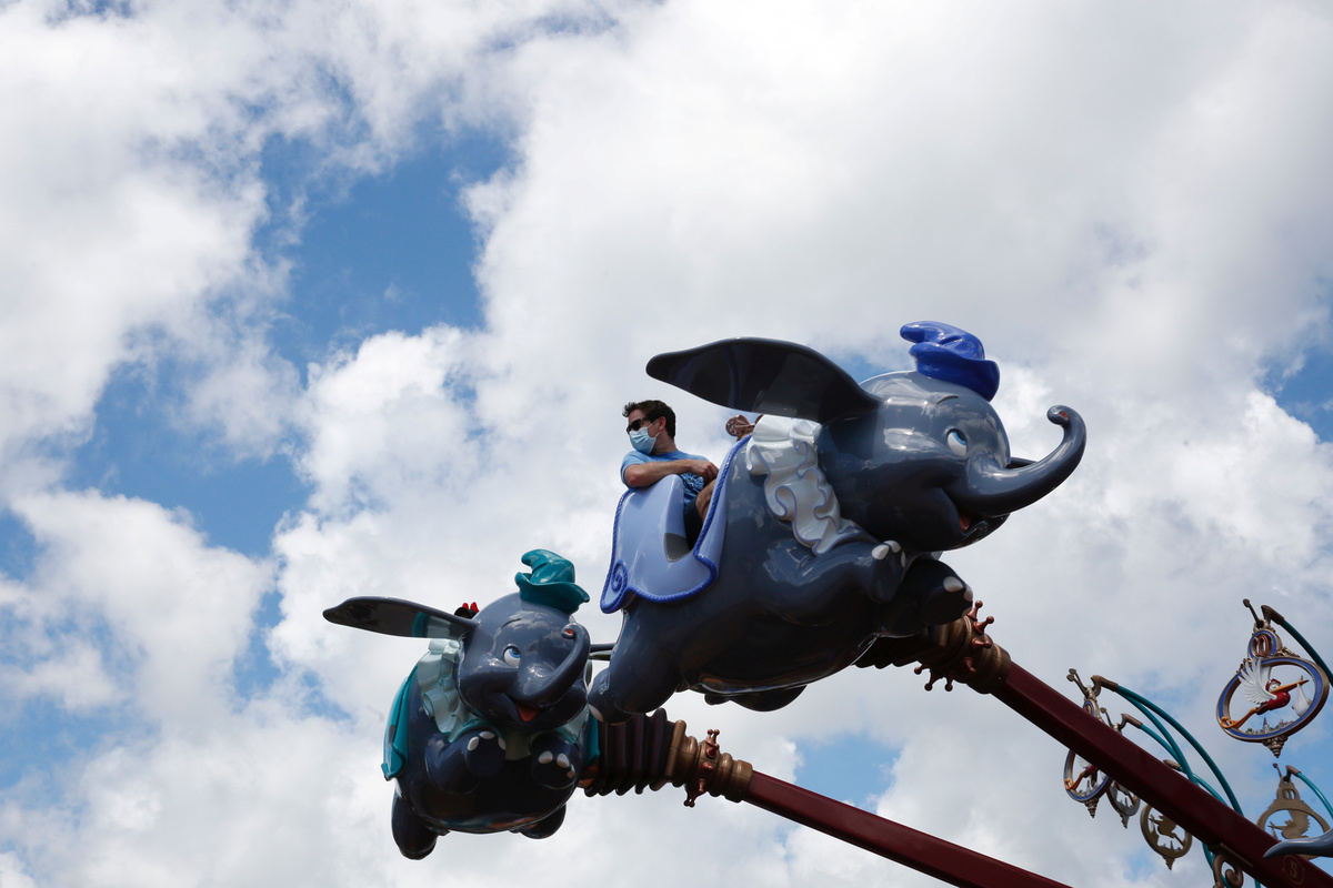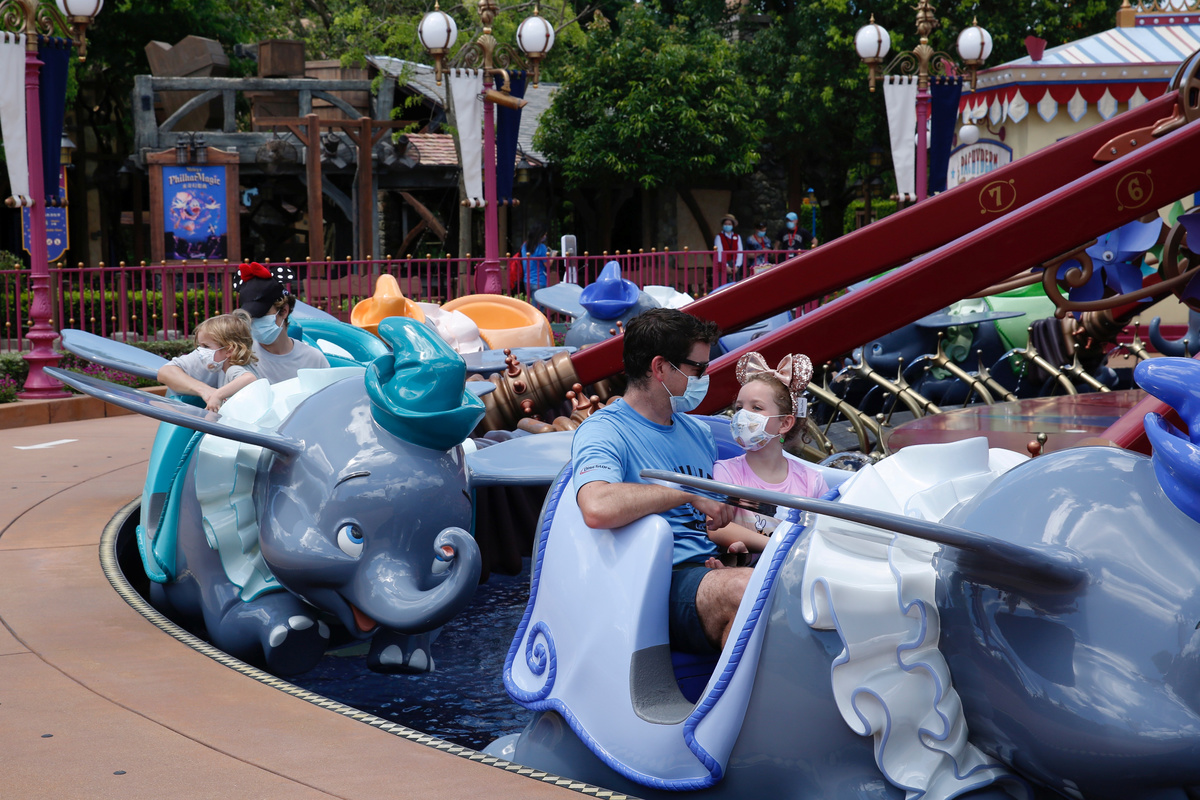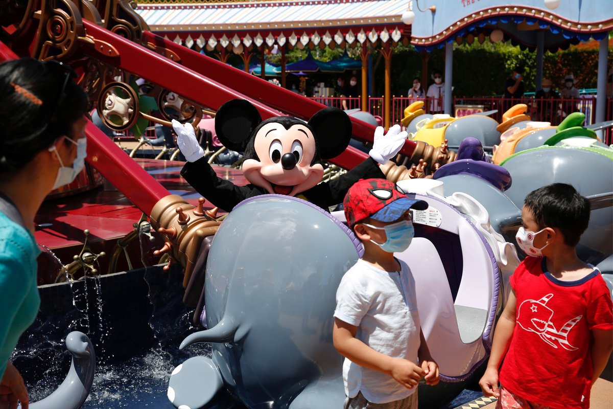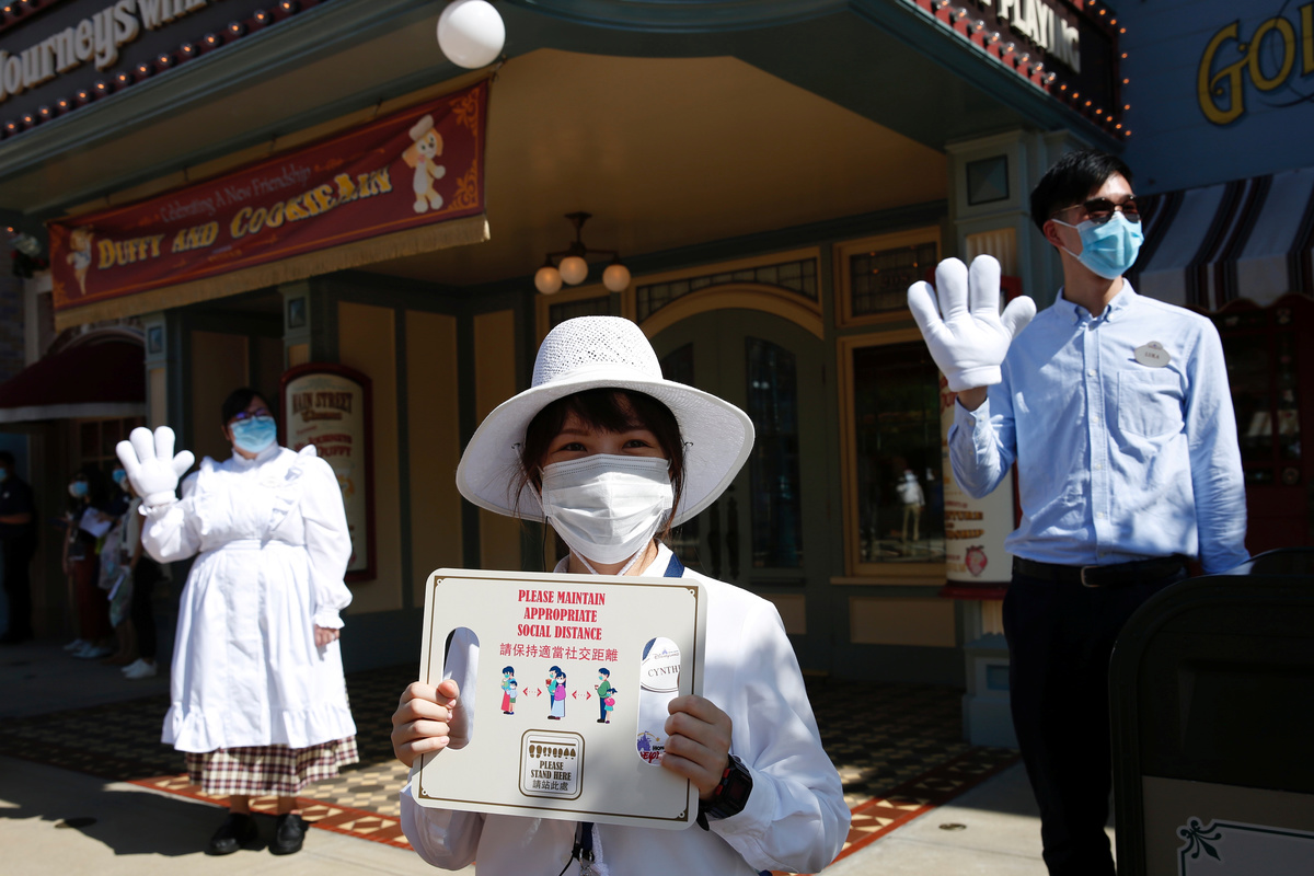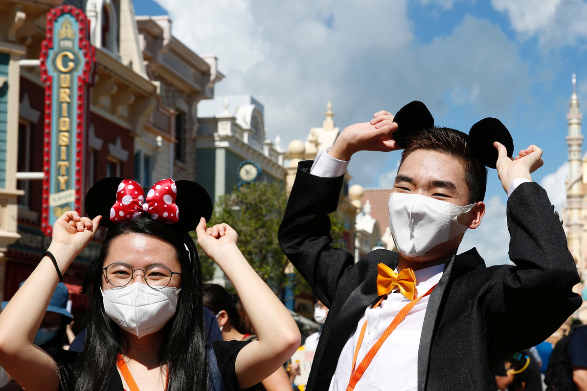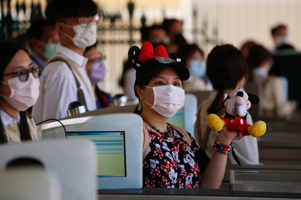A child wearing a protective face mask walks at the Disneyland theme park after it reopened following a shutdown due to the coronavirus disease (COVID-19) in Hong Kong, China June 18, 2020. REUTERS/Tyrone SiuVisitors wear protective face masks as they wait to enter into the Disneyland theme park after it reopened following a shutdown due to the coronavirus disease (COVID-19) in Hong Kong, China June 18, 2020. REUTERS/Tyrone SiuVisitors wear protective face masks as they visit the Disneyland theme park after it reopened following a shutdown due to the coronavirus disease (COVID-19) in Hong Kong, China June 18, 2020. REUTERS/Tyrone SiuEmployees wave to visitors at the Disneyland theme park after it reopened following a shutdown due to the coronavirus disease (COVID-19) in Hong Kong, China June 18, 2020. REUTERS/Tyrone SiuVisitors wear protective face masks as they visit the Disneyland theme park after it reopened following a shutdown due to the coronavirus disease (COVID-19) in Hong Kong, China June 18, 2020. REUTERS/Tyrone SiuAn employee holds a sign to remind about the social distance at the Disneyland theme park after it reopened following a shutdown due to the coronavirus disease (COVID-19) in Hong Kong, China June 18, 2020. REUTERS/Tyrone SiuA visitor wears protective face mask as he sits in a rider at the Disneyland theme park after it reopened following a shutdown due to the coronavirus disease (COVID-19) in Hong Kong, China June 18, 2020. REUTERS/Tyrone SiuVisitors wear protective face masks as they sit in a rider at the Disneyland theme park after it reopened following a shutdown due to the coronavirus disease (COVID-19) in Hong Kong, China June 18, 2020. REUTERS/Tyrone SiuVisitors wear protective face masks as they take photos at the Disneyland theme park after it reopened following a shutdown due to the coronavirus disease (COVID-19) in Hong Kong, China June 18, 2020. REUTERS/Tyrone SiuVisitors wear protective face masks as they pose for photos with Mickey Mouse at the Disneyland theme park after it reopened following a shutdown due to the coronavirus disease (COVID-19) in Hong Kong, China June 18, 2020. REUTERS/Tyrone Siu