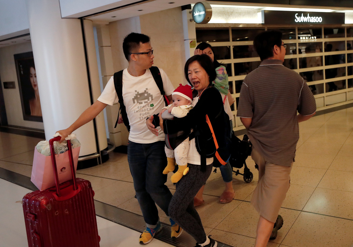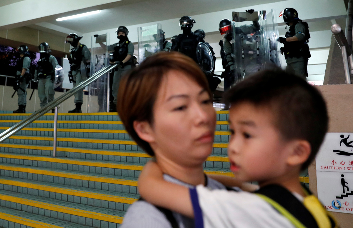 A human chain in Cityplaza, in the eastern suburb of Taikoo Shing, turned into a face-to-face conflict with police, running up and down escalators where families with young children had been window shopping just minutes before and watching skating on the ice rink.