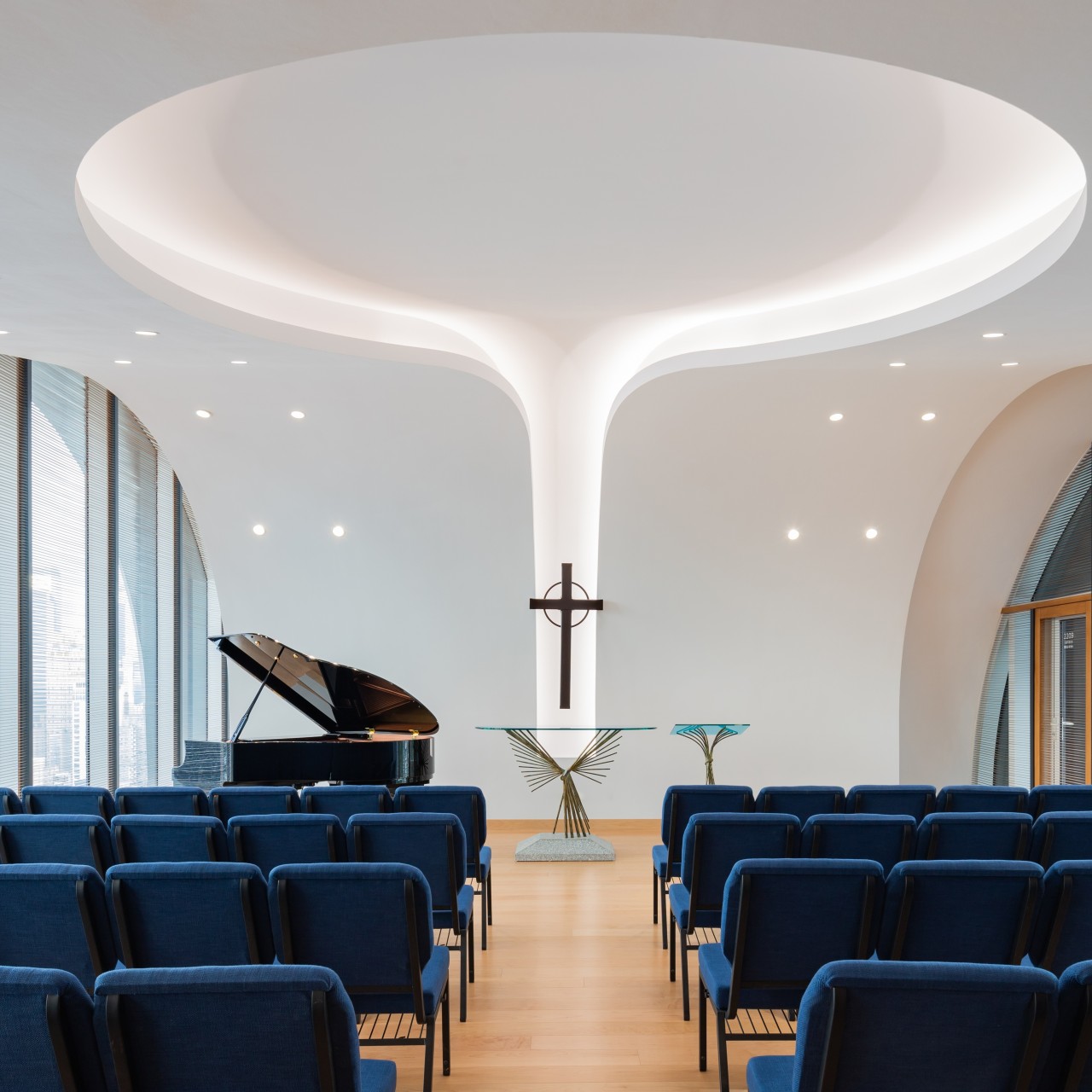 The spaces inside are “fluid and uplifting”, culminating with the Sky Chapel at the top that has harbour views to the north, and green hills to the south.