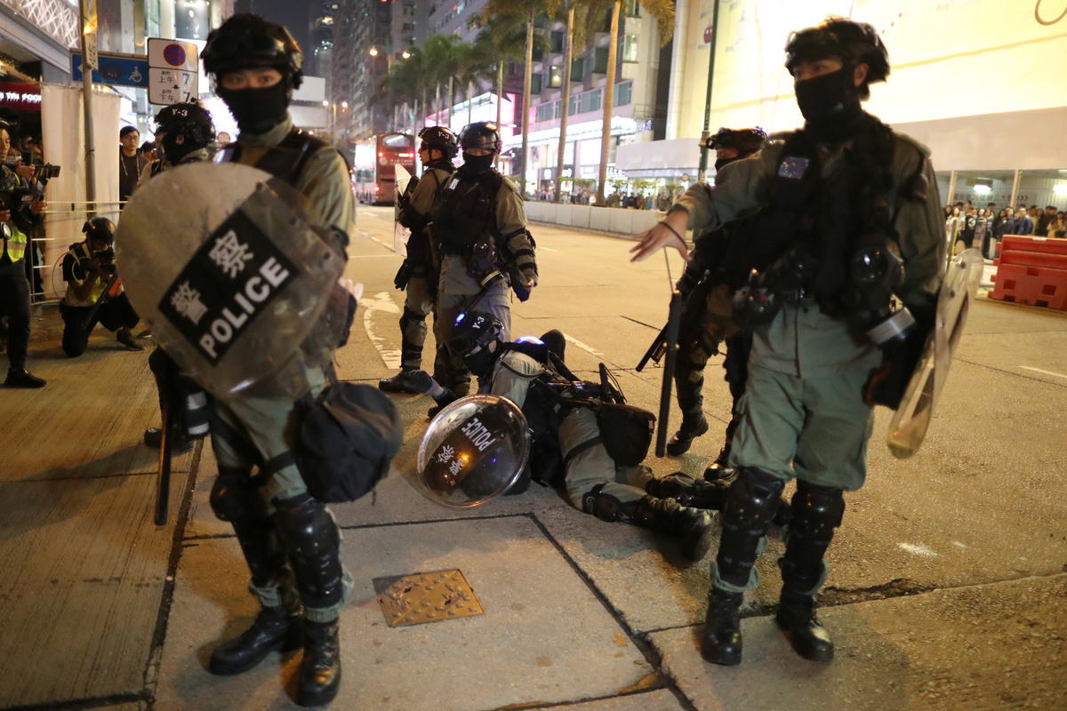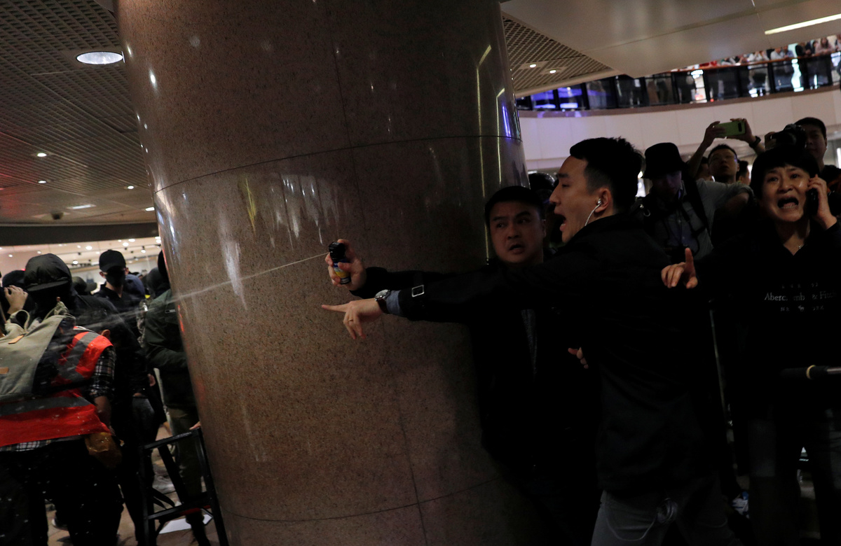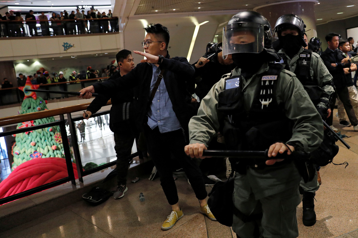 Protesters inside the malls threw umbrellas and other objects at police who responded by beating some demonstrators with batons, with one pointing his gun at the crowd, but not firing.