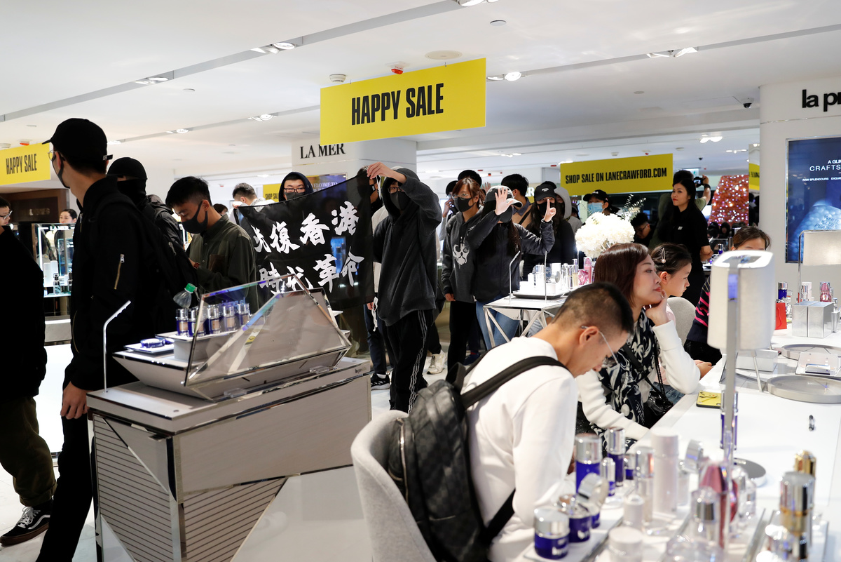 Scores of black clad, mask wearing protesters chanted slogans including "Revive Hong Kong, revolution of our time," and "Hong Kong independence" as they roamed the malls.