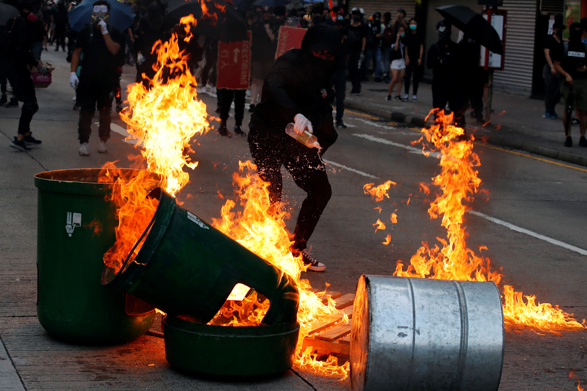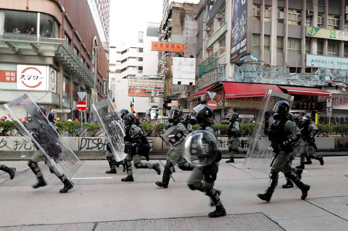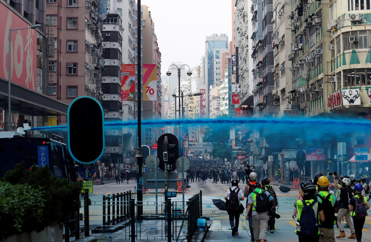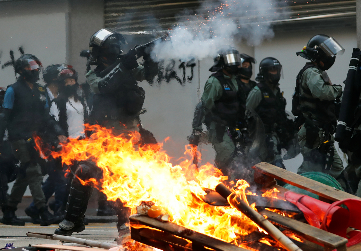 Banks and other businesses linked to China were attacked and bonfires lit on Nathan Road, a main road running through the heart of the Kowloon peninsula. Police fired volleys of tear gas and baton charged demonstrators, and also hosed them down from water cannon.