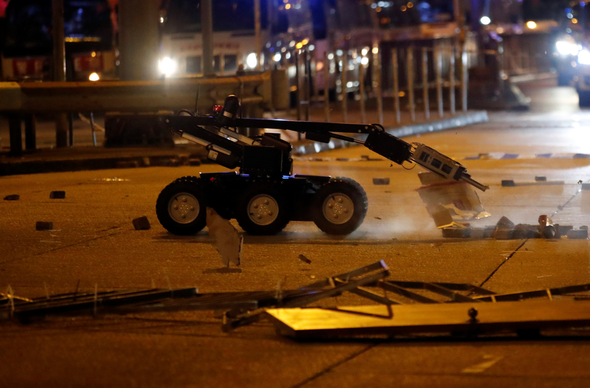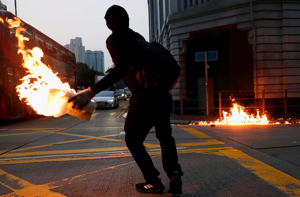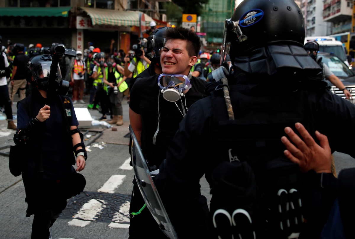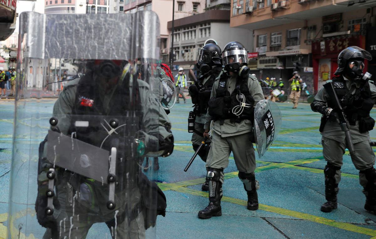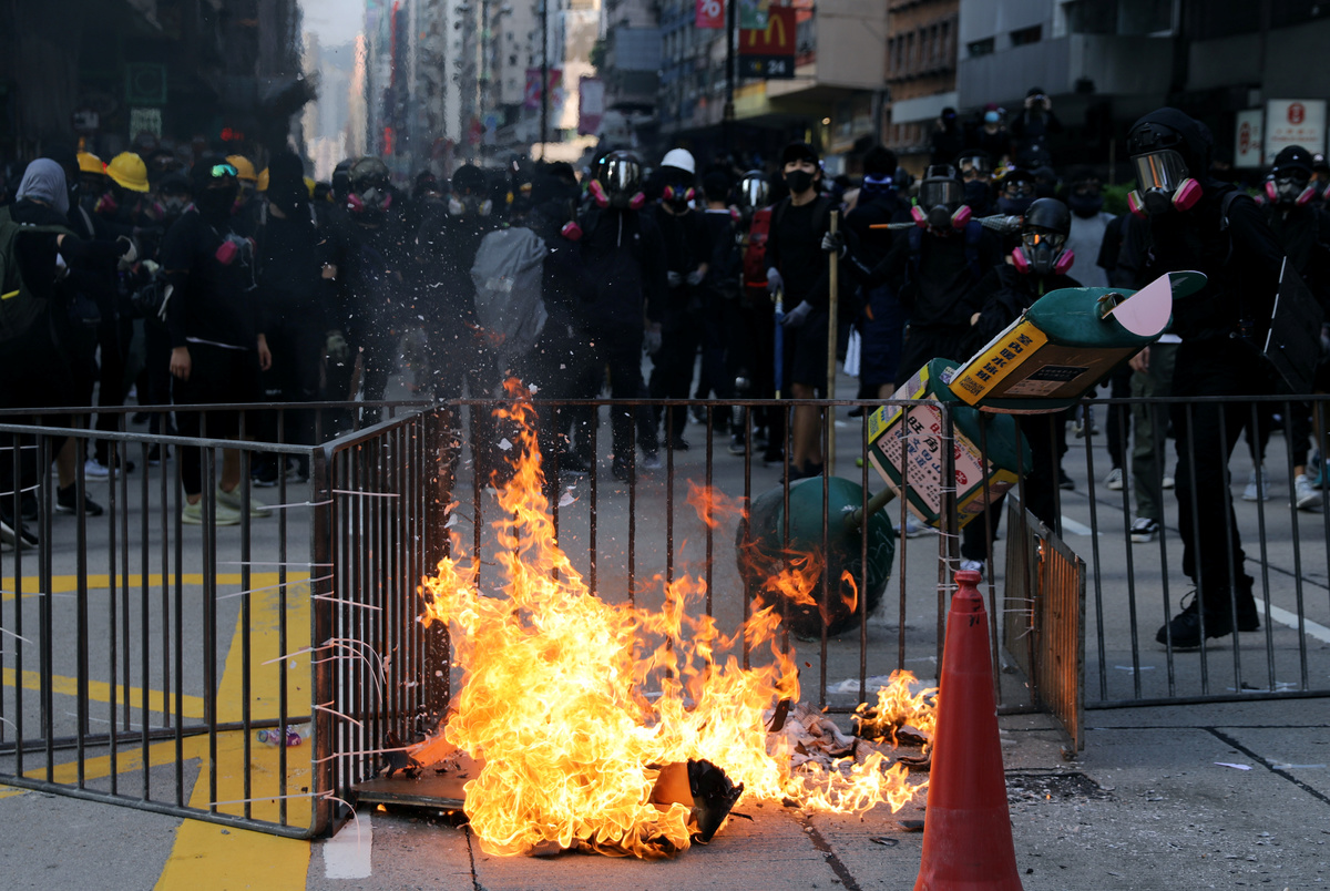 Banks and other businesses linked to China were attacked and bonfires lit on Nathan Road, a main road running through the heart of the Kowloon peninsula. Police fired volleys of tear gas and baton charged demonstrators, and also hosed them down from water cannon.